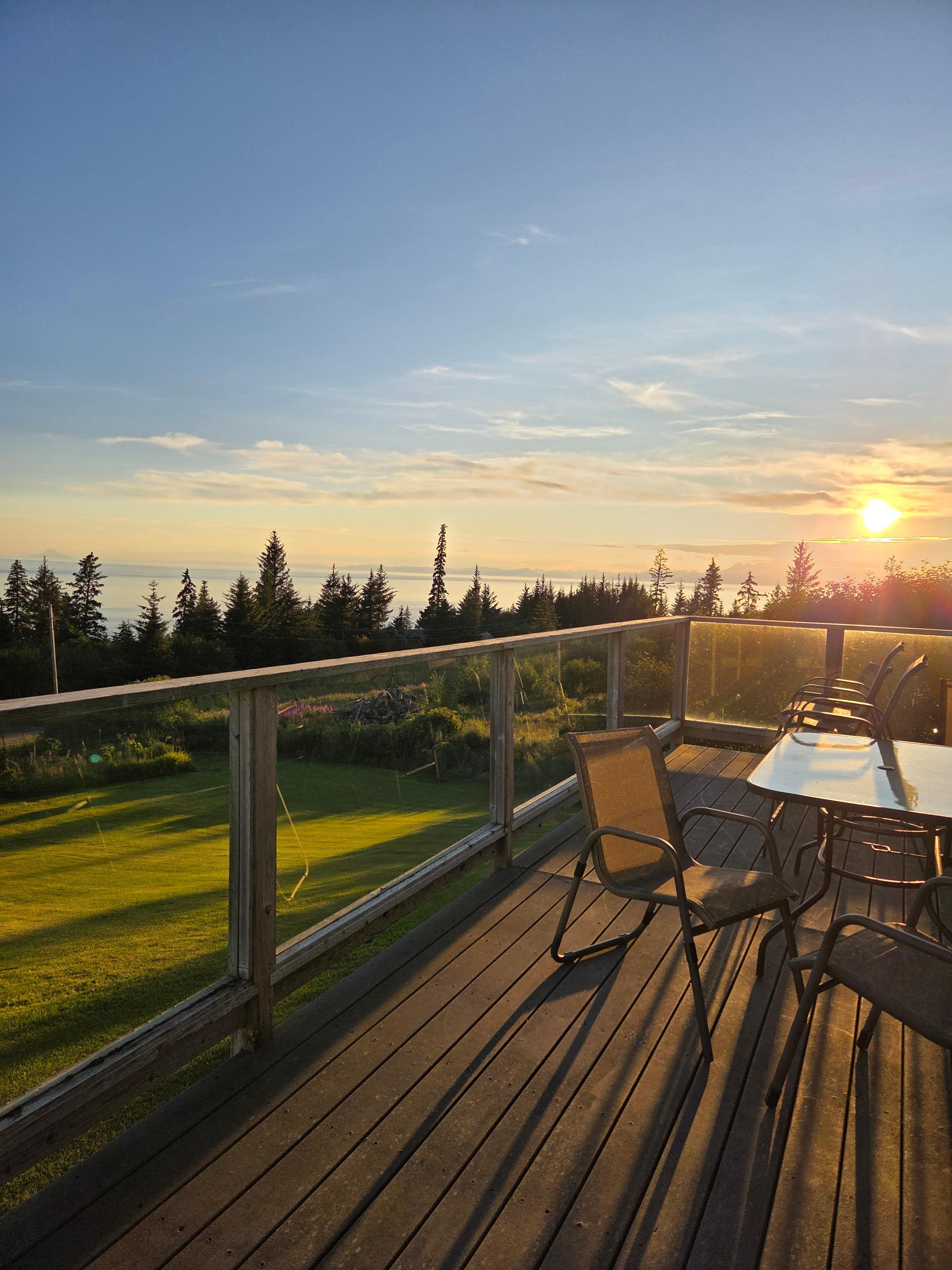 Outside there is a large front deck with glass enclosed railings to protect you from the elements while eating dinner, having a cocktail, or just enjoying the amazing view. There is a gas BBQ on the porch just outside the front door. The yard has a firepit which is always a favorite on those chilly Alaska evenings. There is a large flat grass area at the back of the cabin which is good for playing volleyball or other yard games. Parking is not an issue with room for multiple vehicles or even a boat or RV trailer.