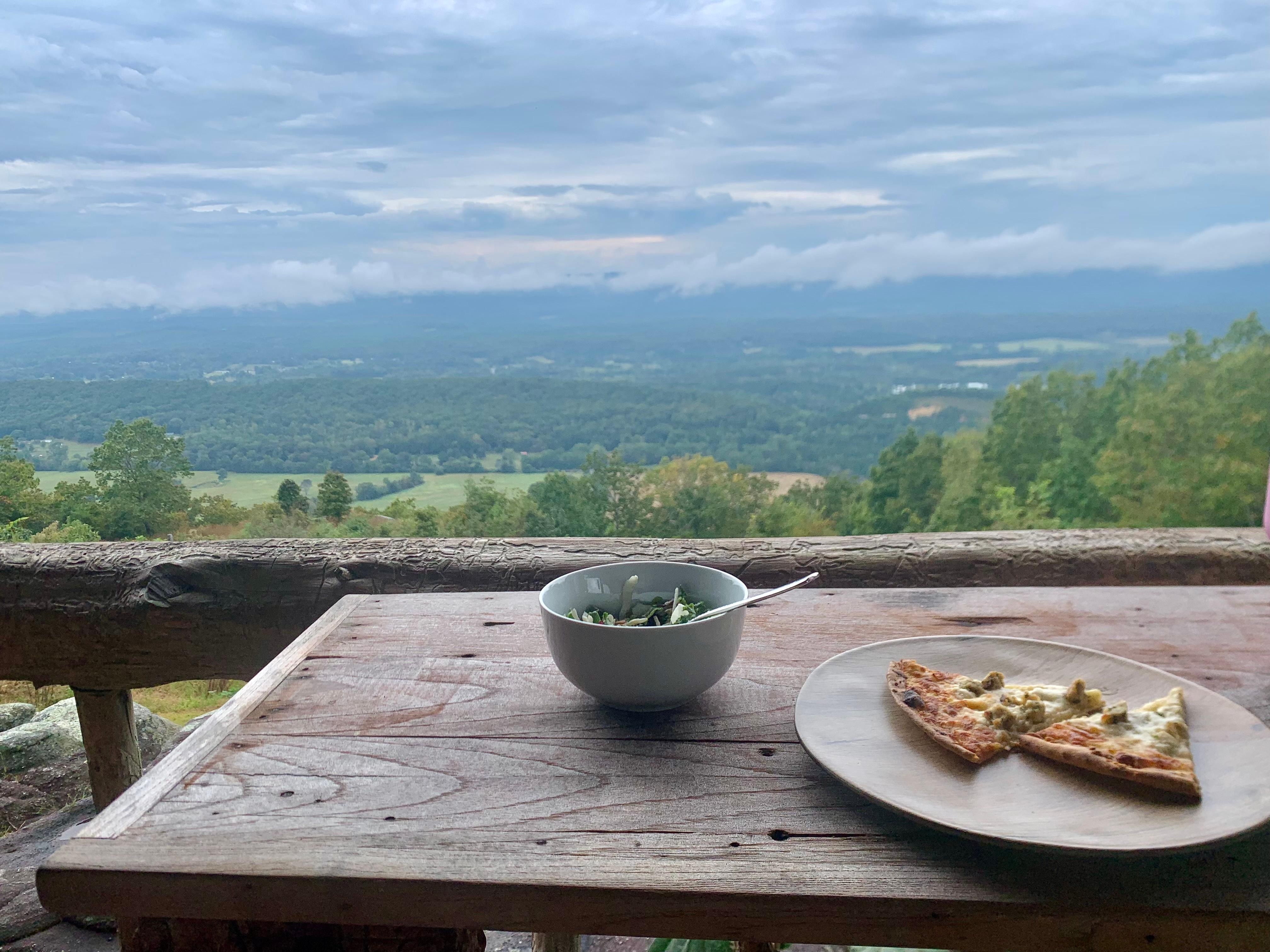 The amazing outdoor covered living space is so relaxing and peaceful. It offers a hot tub, outdoor dining, a gas grill and comfortable oversized Amish rocking chairs that enable you to see the view and not look at the railing. The deck also overlooks incredible boulders with space to roam or enjoy the new solo stove bonfire = low smoke & hot fire with comfortable Adirondack chairs.