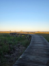 Special Notes: The owner lives on-site. The House adjacent to the Carriage House also rents on VRBO and common areas are accessible to both rentals. The Carriage House is on the second floor over the garage and is not wheelchair accessible. Accessing the mezzanine from the ships ladder does require an adult to crawl out/stoop down till under the peek of the roof where headroom is at its maximum. Additionally, families with young children, please note there are elevated decks and porches with railings, a mezzanine bunk area with steep ships ladder, an unfenced pond and pool, a boardwalk without railings over the sawgrass estuary, and the owner’s pets and barnyard animals freely roam the grounds. This rental is pet friendly (if pet fee paid at booking) however due to the free ranging dogs, cats, chickens, ducks, geese, and turkey, visiting pets must be kept on a lease when outdoors (unless enjoying the beach/bay). The one resident rooster will crow in the early morning hours. As an estate, renovation, alterations and/or upgrades may be ongoing on-site during the lease period. Such work, if any, would be limited to the grounds (driveway, pond, dock, landscaped areas, forest, etc.) and would not be on or within the leased property itself (the Carriage House).