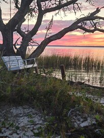 Fresh, comfortable carriage house above garage nestled on 120 acres on Blackwater Bay. If you’d like to relax in nature but have all the creature comforts of home, this is the place. Large great room, vaulted ceilings, full size kitchen, gas fireplace, front porch with ceiling fans & outdoor speakers, and a large back deck with outdoor speakers over the sawgrass estuary. An 800’ boardwalk over the seagrass estuary leads to the sand beach, bay, pier and boathouse. The boathouse includes power, water, lighting, underwater fish light and Bluetooth sound system. The property also includes a gated entry, a duck pond, night lighting, a pool, and incredibly beautiful views.
