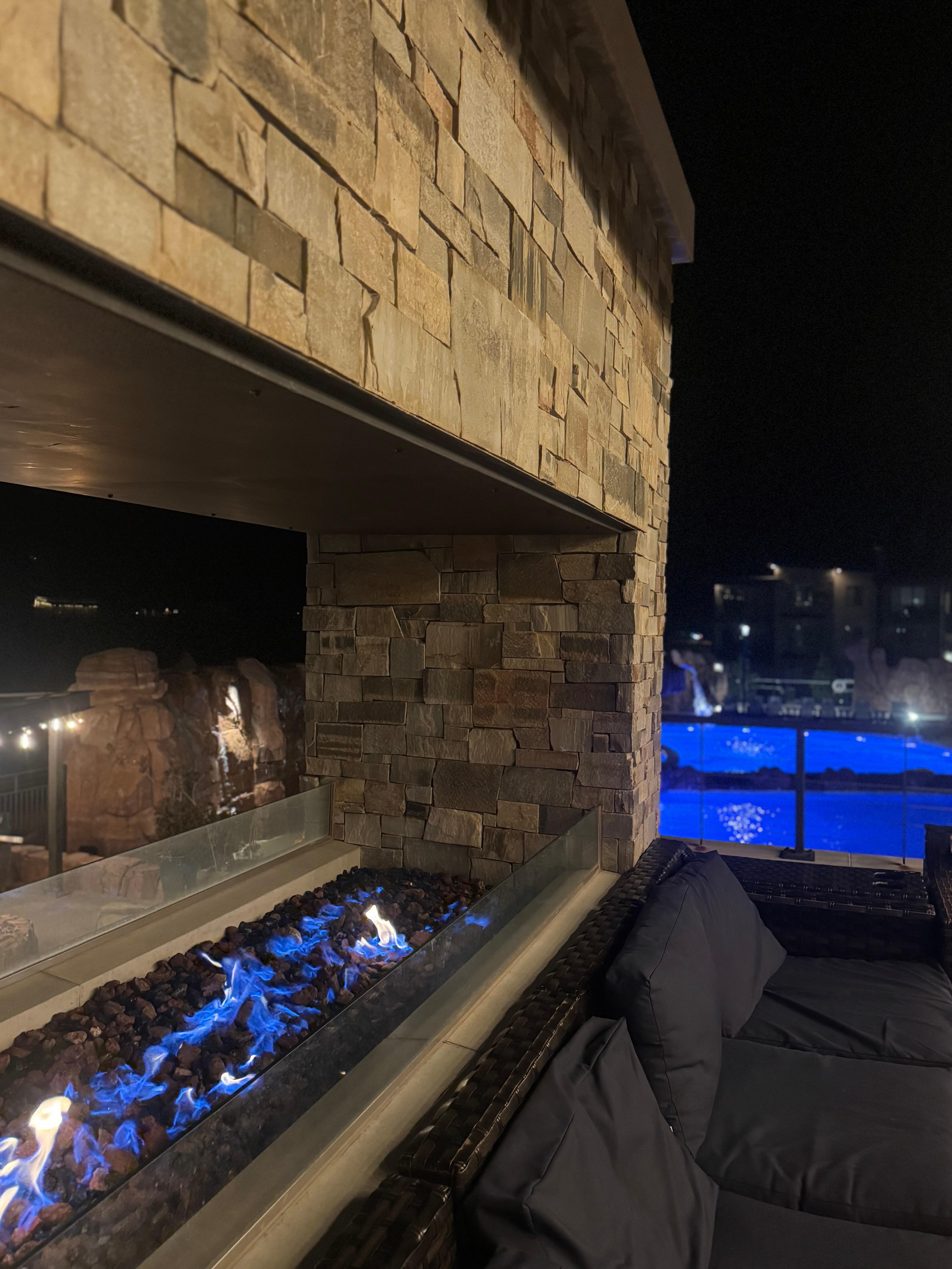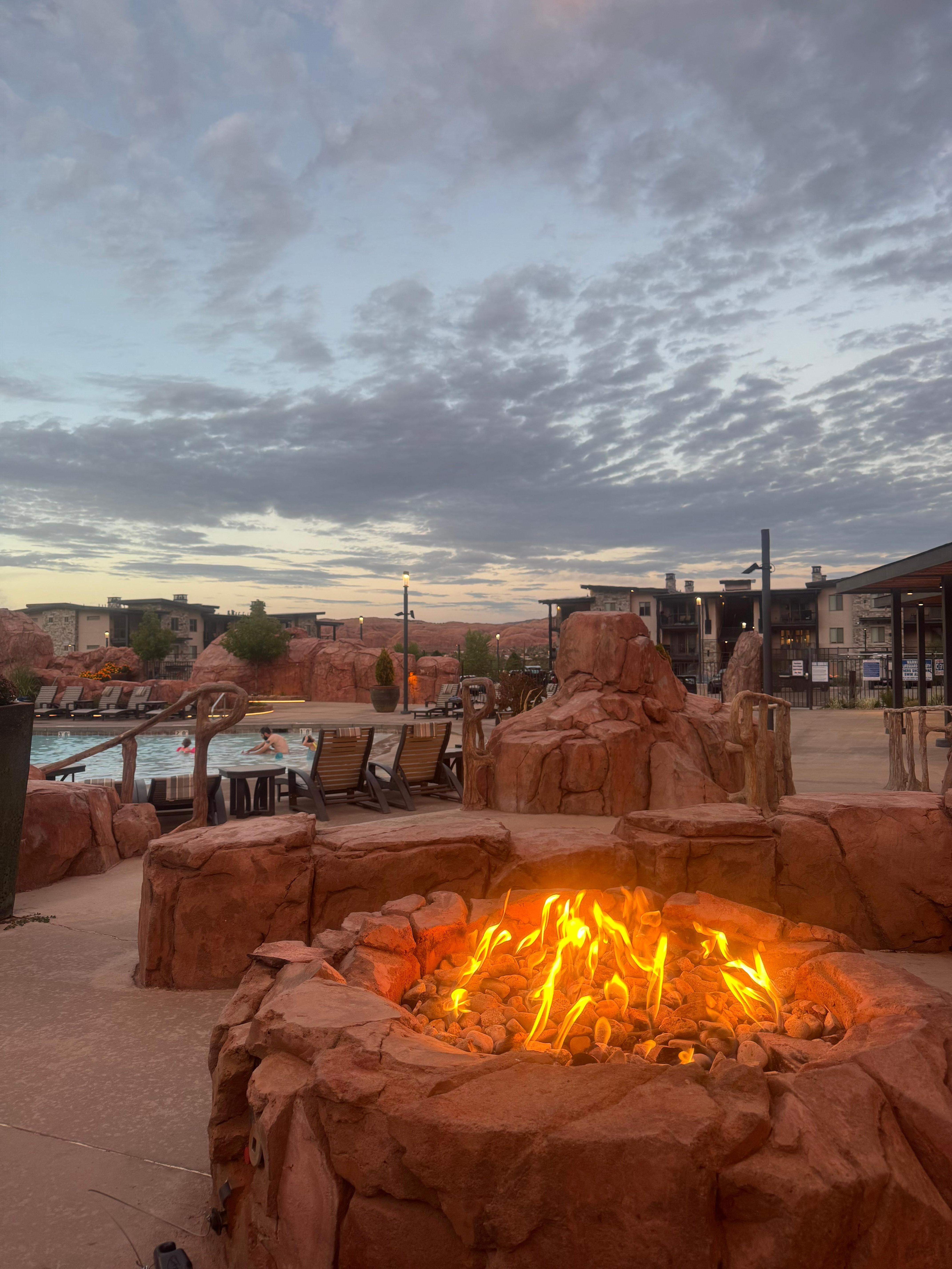 * Seating areas around fire pits and pool