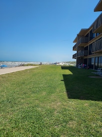 Relax and unwind with the whole family on this first floor 2 bedroom 2 bathroom beach front condo. The only thing separating you from the beach is a small patch of grass and a seawall. Enjoy a 180 degree direct view of the Gulf of Mexico. Sip some coffee on the front patio as you watch the sunrise over the Gulf of Mexico.