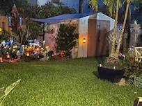 • Backyard patio with a new Weber grill, outdoor TV, dartboard, and cornhole set.