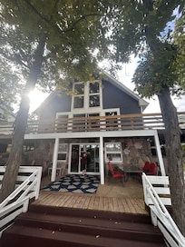 This charming waterfront home features open, airy living spaces with soaring ceilings and expansive windows that frame stunning lake views. The classic A-frame design offers two full kitchens, four bedrooms, and three full baths, comfortably accommodating up to eight guests.
