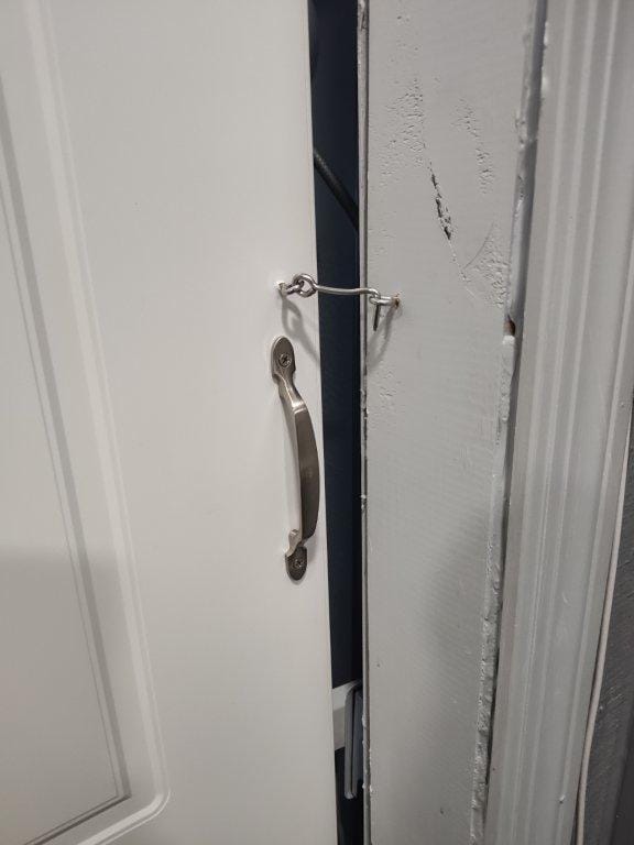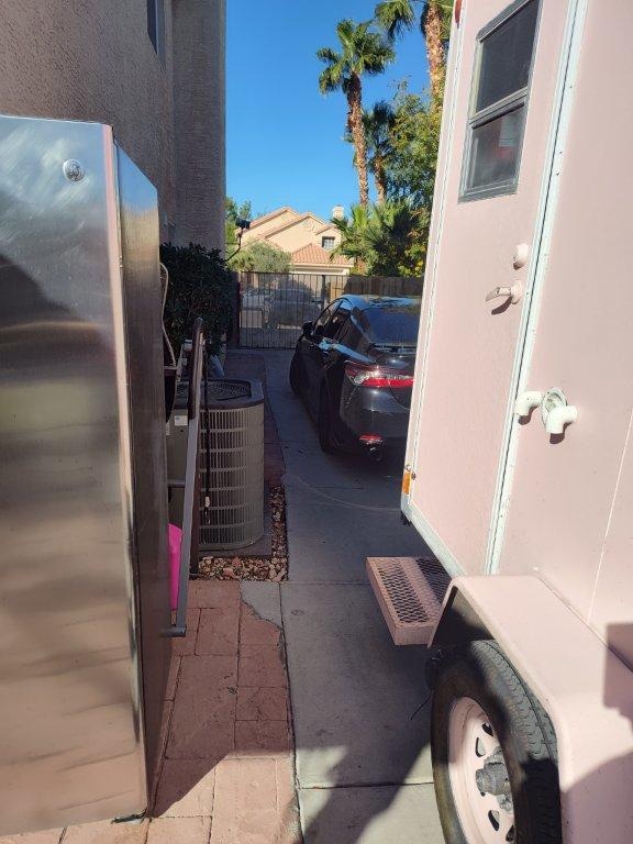 TITLE: Great location, but a sense of humor is mandatory! Just minutes from the Las Vegas Strip, in what appears to be a safe neighborhood, we arrived at this home after dark. The safeness of the neighborhood felt reduced when seeing several cars in the driveway, with one of them being up on blocks. Okay, what’s next… We opened the driveway’s gate and saw that we had to maneuver our luggage through the approximately two-foot-wide space between the house and a mobile commercial food-trailer. The driveway remained dark until the motion-sensing lighting only came on after we made it past the trailer. This path and the rest of the property does NOT allow for anyone handicapped, especially in a wheelchair. Moving forward into the yard, we were greeted by the yapping of the cute Chihuahua dogs which were in a cage. The “cabin” itself looked cute and the key was where we were told it would be. Let’s venture inside…Stepping through the door, we saw the dimensions to be more like a micro-studio apartment which shrunk in the dryer. There is an exposed five-gallon water jug with a battery-operated pump for drinking water. The sink area was clean with an adequate supply of dishes, glasses, flatware, etc. The microwave and coffee maker all worked well and coffee was provided. Suggestion… when you provide coffee, it is polite to also provide creamer and sugar. The two barstools did not have enough room for two people to actually sit at the counter. We ended up sitting on the bed