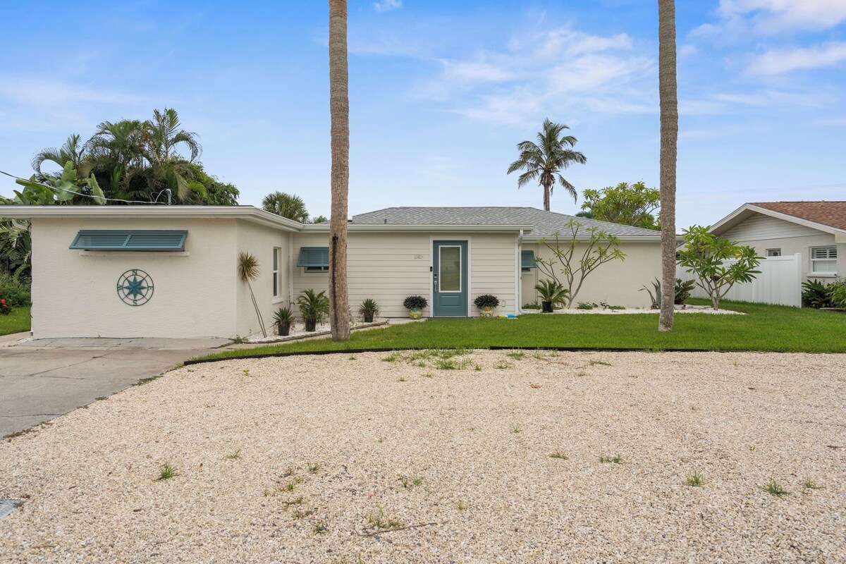 Englewood is waiting for you at this charming 2-bedroom 2-bath waterfront home with direct access (no bridges) to the Intracoastal Waterway. This adorable property features 2 king beds, 1 bunk bed, and a cozy living room with a full-size Murphy bed, comfortably accommodating your group. Step outside to enjoy a private, heated pool and hot tub, perfect for relaxing. The comfortable outdoor space includes a cute seating area including a table with a built-in fire pit — ideal for evening gatherings under the stars. AC and heating ensure a comfortable stay year-round. Located just 1/2 mile from the charming Dearborn Street filled with amazing restaurants, beautiful boutiques, and events. *Please note that due to county restrictions, a 28 night minimum stay is required.