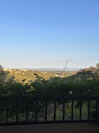 Living: Bright and cheery, there is light radiating from all four window directions in the living room and kitchen, as well as from skylights above. The white Venetian plaster walls with a waxed finish display important art collections handed down through our family. There are grand 12 foot tall ceilings with beautiful Ponderosa vigas & latias and stately 8 foot tall doors. There is a generous full length covered portal along the living room and back of the house with large full view windows overlooking a natural valley, with the Jimez mountains and sunsets as backdrops. Warm up to the adobe viga gas fireplace, which is turned on with the flip of a switch.
