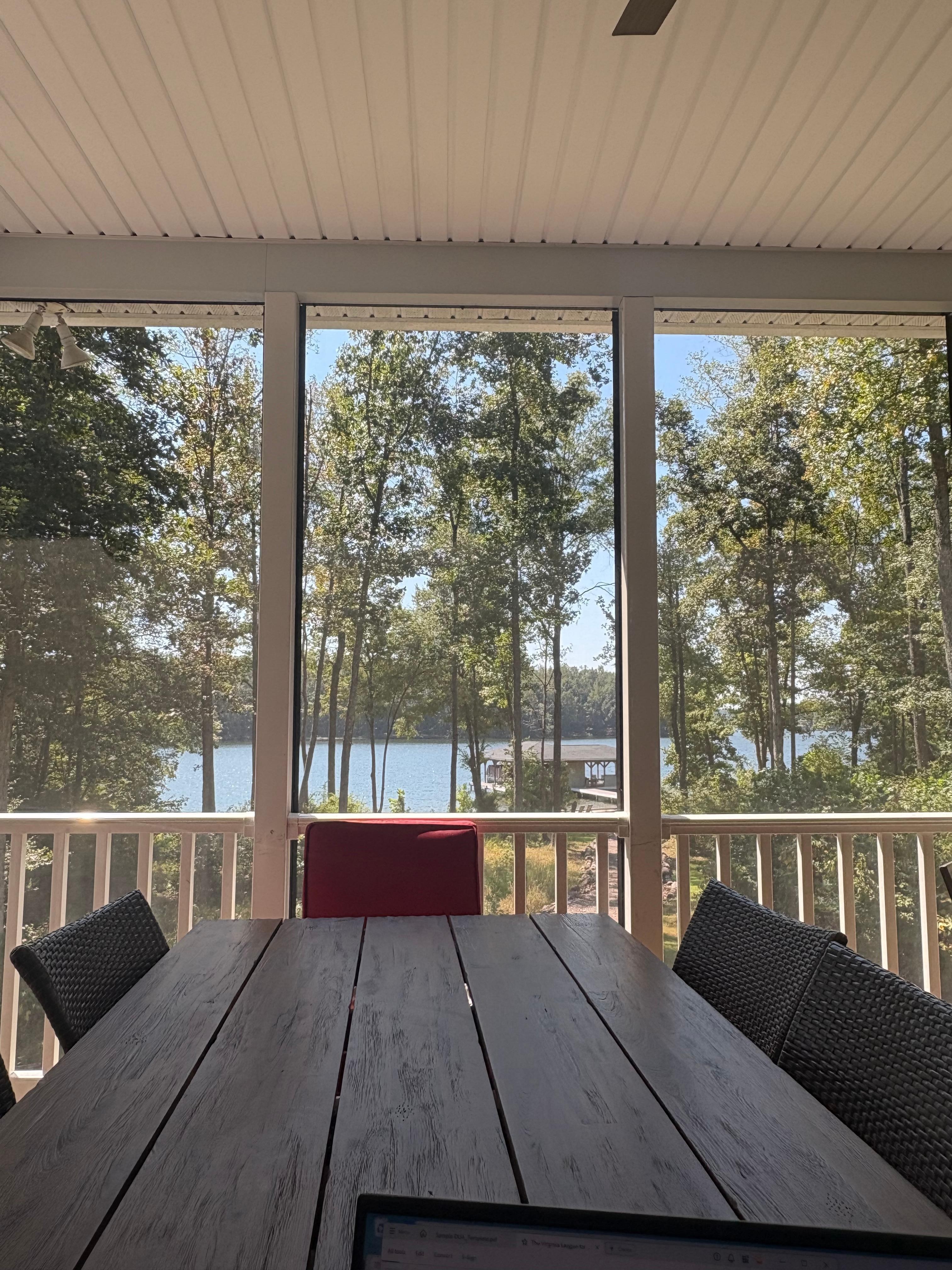 Huge screened-in deck perfect for outdoor meals and lakefront view relaxation, all in a bug-free environment.