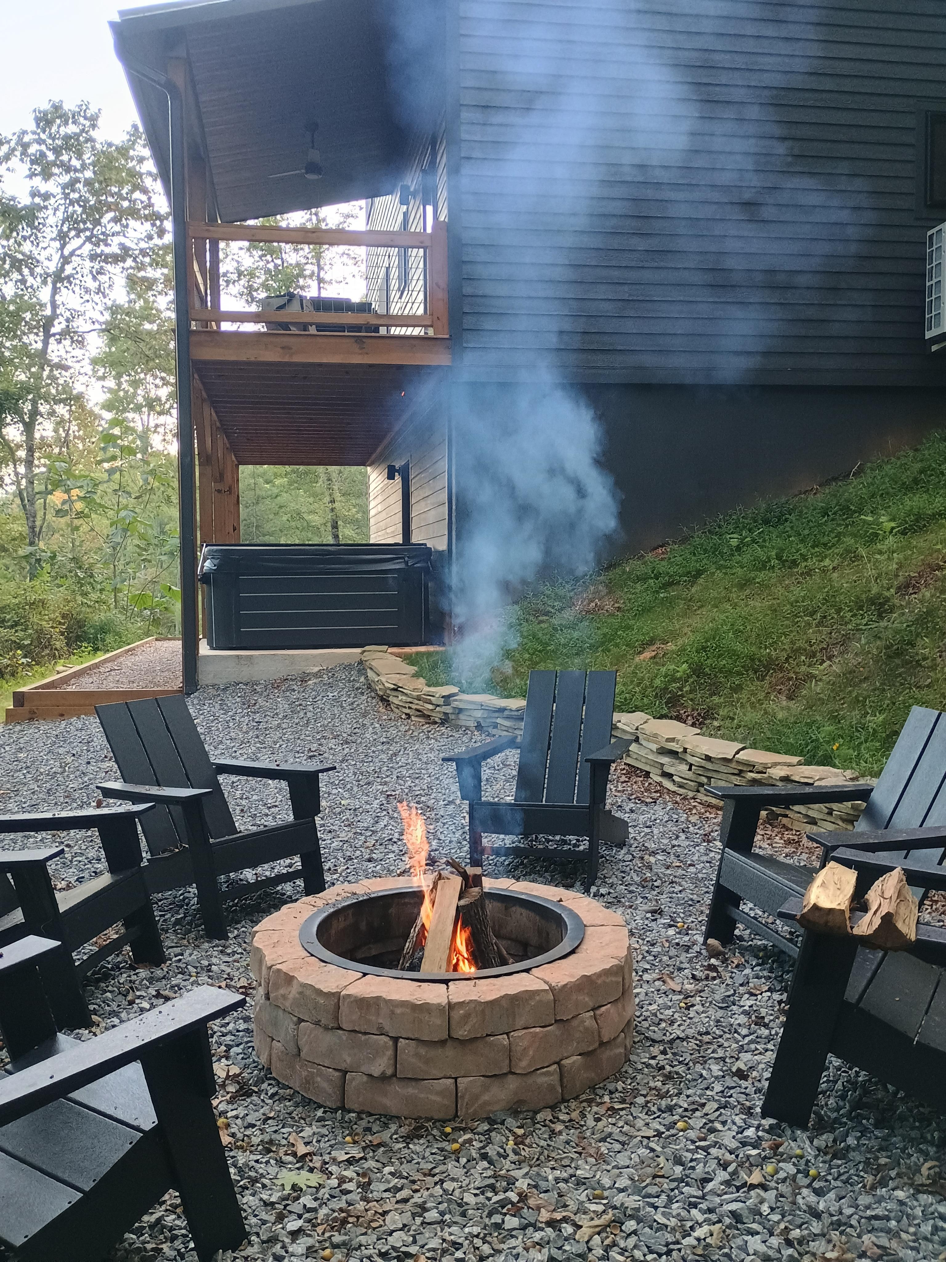 OUTDOOR AMENITIES: 2-level furnished deck, outdoor fan, wood-burning fire pit w/ Adirondack chairs, patio w/ gas grill, private hot tub, cornhole set, peaceful wooded setting