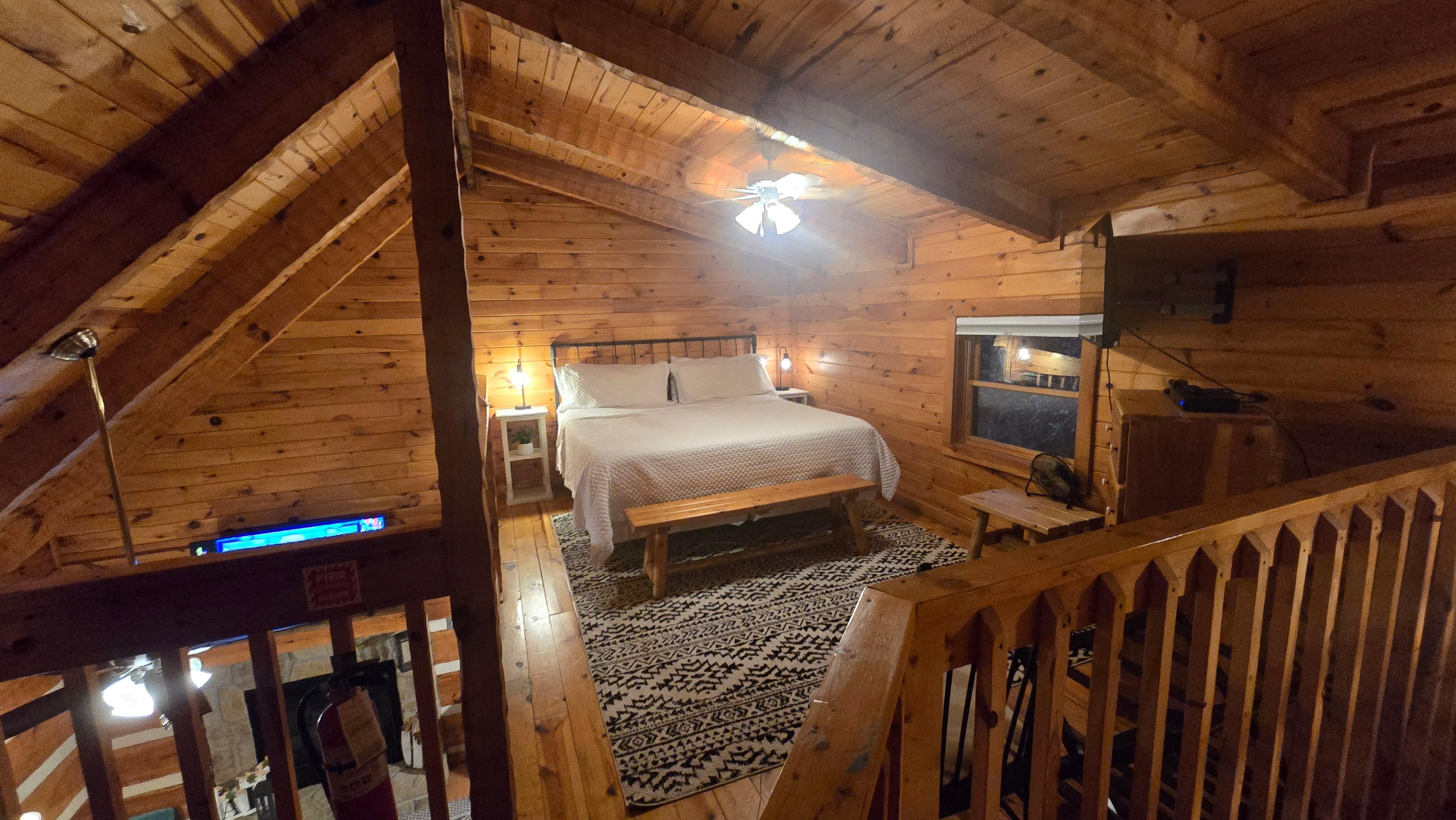 Lemmikkieläinystävällinen THIS AWAY on 900 SF -mökki, johon mahtuu 4 vierasta. Ensimmäisen kerroksen makuuhuoneessa on täysi sänky ja suuressa avoimessa parvella queen-vuode. Jokaisessa hyttitasossa on täysi kylpyamme ja parvella olevassa kylpyhuoneessa on poreallas, joka sopii erinomaisesti hiljaiseen liotukseen. Molemmissa makuutiloissa on 32 tuuman taulutelevisio peruskaapelilla.