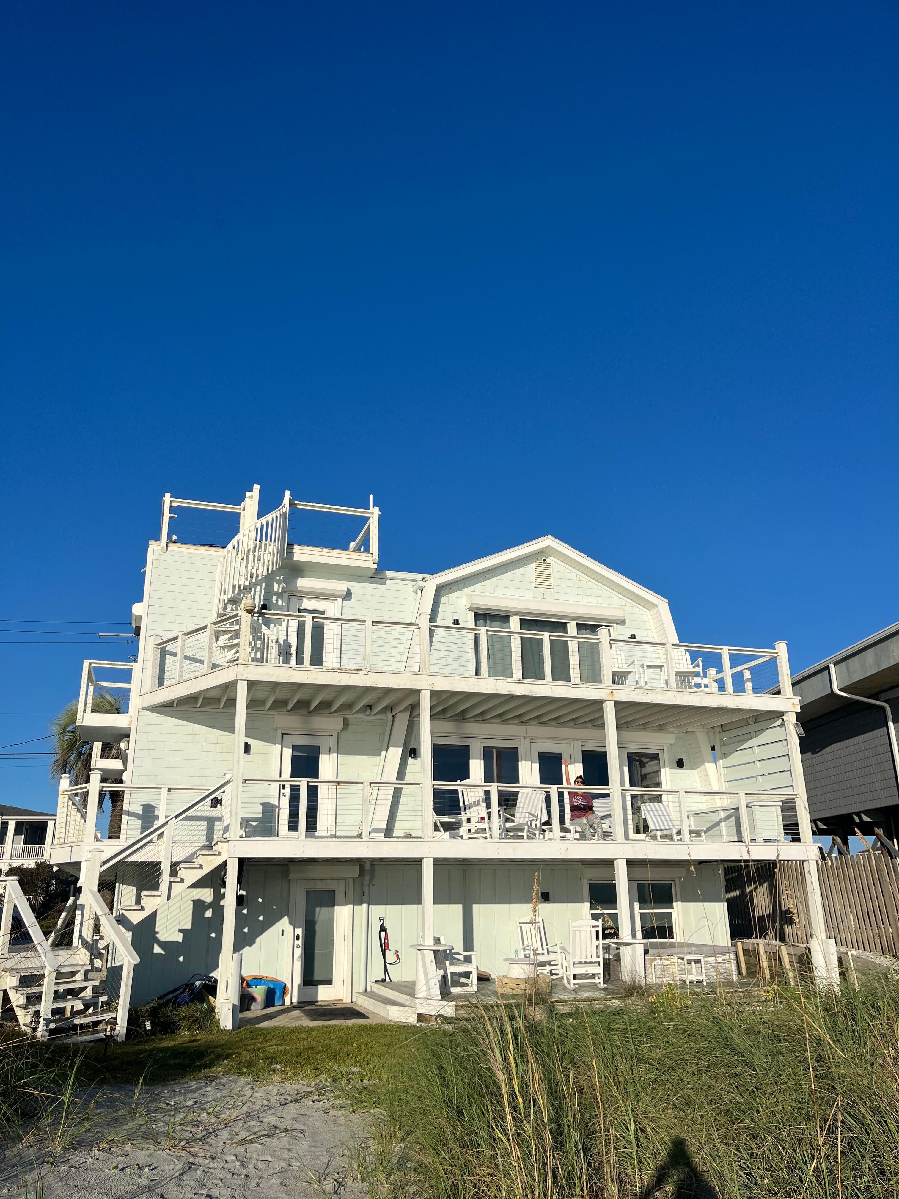 This oceanfront vacation rental is a spacious 3,100sqft 5 bedroom/5 full bathroom beach retreat with private beach access that comfortably sleeps 13 guests (in addition to the 5 bedrooms, there is a queen size Murphy bed on the first floor). Enjoy the beautiful ocean views with balcony access from all 3 levels. This home is well lit with plenty of windows and offers a spectacular relaxing beach color scheme and tile throughout.
