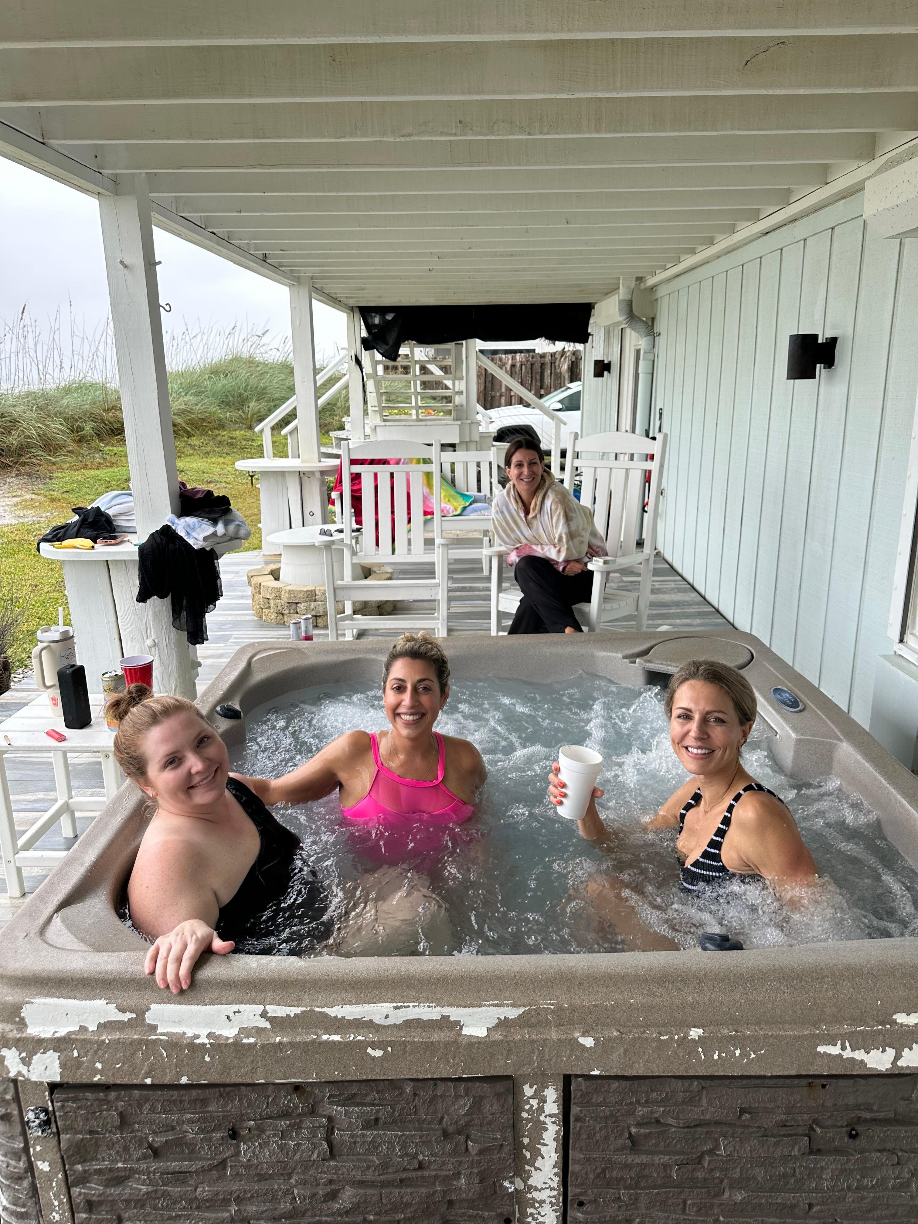-Beach view covered outdoor patio with outdoor seating, stairs to the second and third level balconyâs, and a jacuzzi