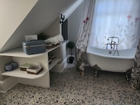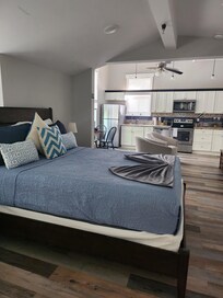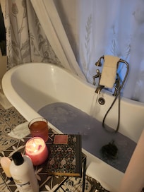 Indulge in Victorian-Era styling complemented by luxury finishes at this unique accommodation. The studio features a relaxing clawfoot tub, a fully equipped kitchen, and other high-end amenities, perfectly blending old-world charm and contemporary comforts.