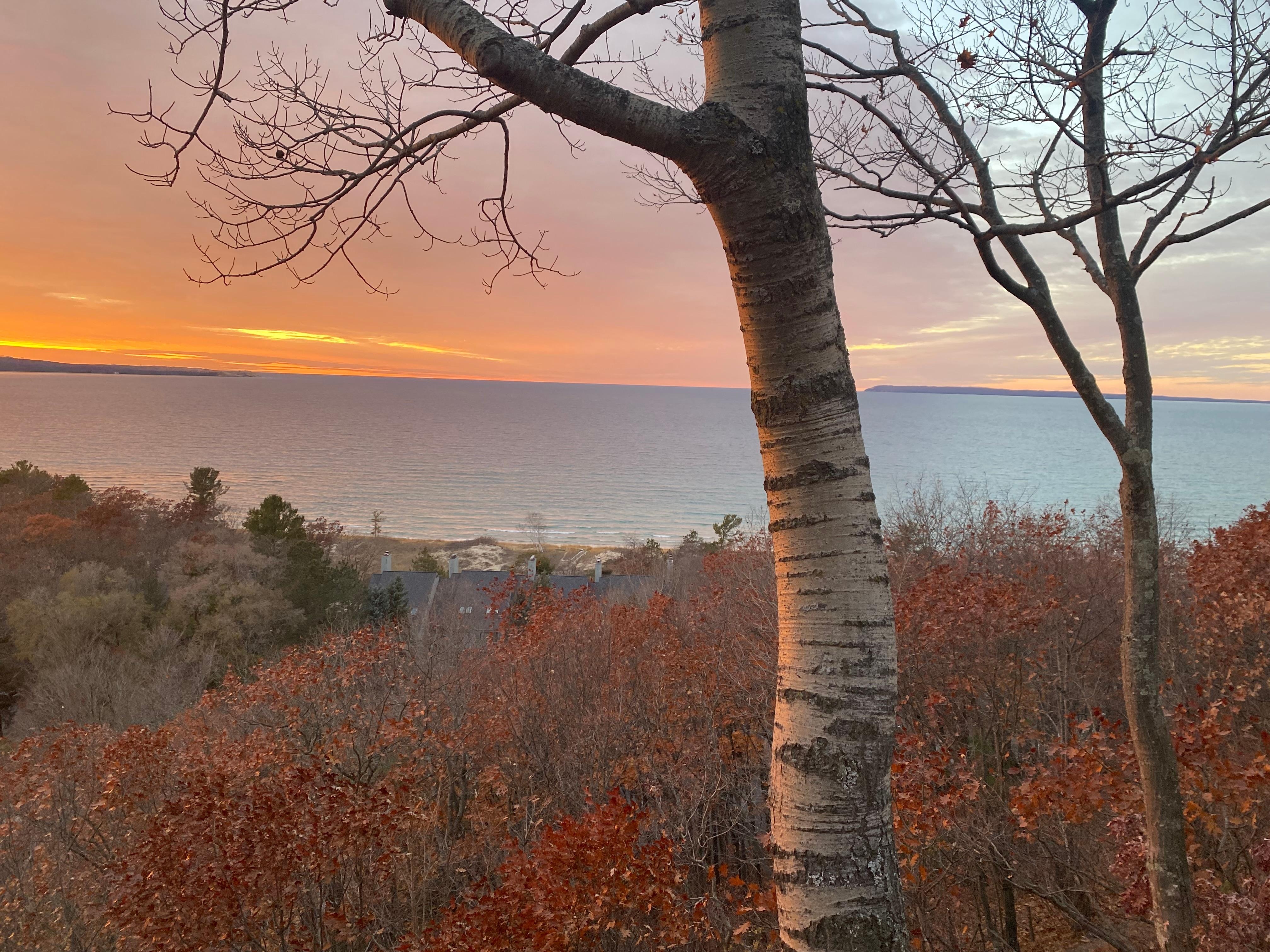 Wake up to beautiful views of Lake Michigan from this upper-level end condo! Two bedrooms and two bathrooms make this retreat perfect for small families and couples. The deck, which has been furnished with a small outdoor dining area, is the perfect spot to admire the views of Lake Michigan and Sleeping Bear Bay. The beautiful and spacious living room features a wood-burning fireplace, a TV with cable, and a sleeper sofa. Views can be admired from the living room as well. The kitchen is complete with stainless steel appliances and a breakfast bar for three. The adjoining dining table has enough space for six, making it ideal for more formal family meals. Additional amenities include an on-site washer/dryer, TVs in both bedrooms, high-speed WiFi, and two fireplaces.