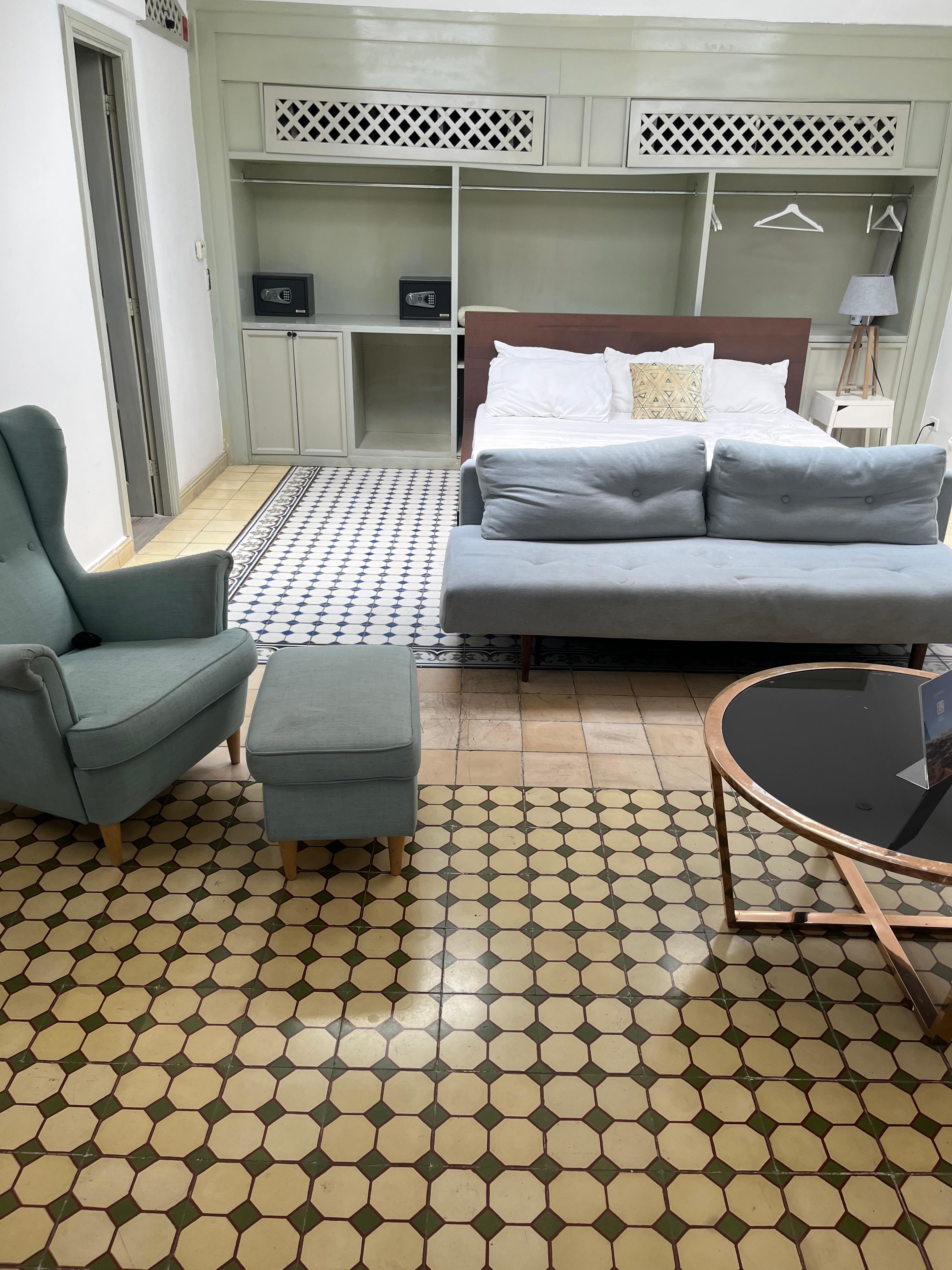 - Bedroom: Elegant and comfortable, with a king bed, air conditioning, blackout curtains, wardrobe, hangers, bedding, night lamp, iron, ironing board.