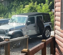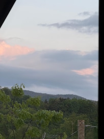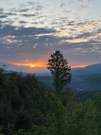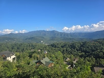 * The second bedroom on the top floor has a plush king-sized bed and access to a private deck that offers breathtaking views of Mt. LeConte.