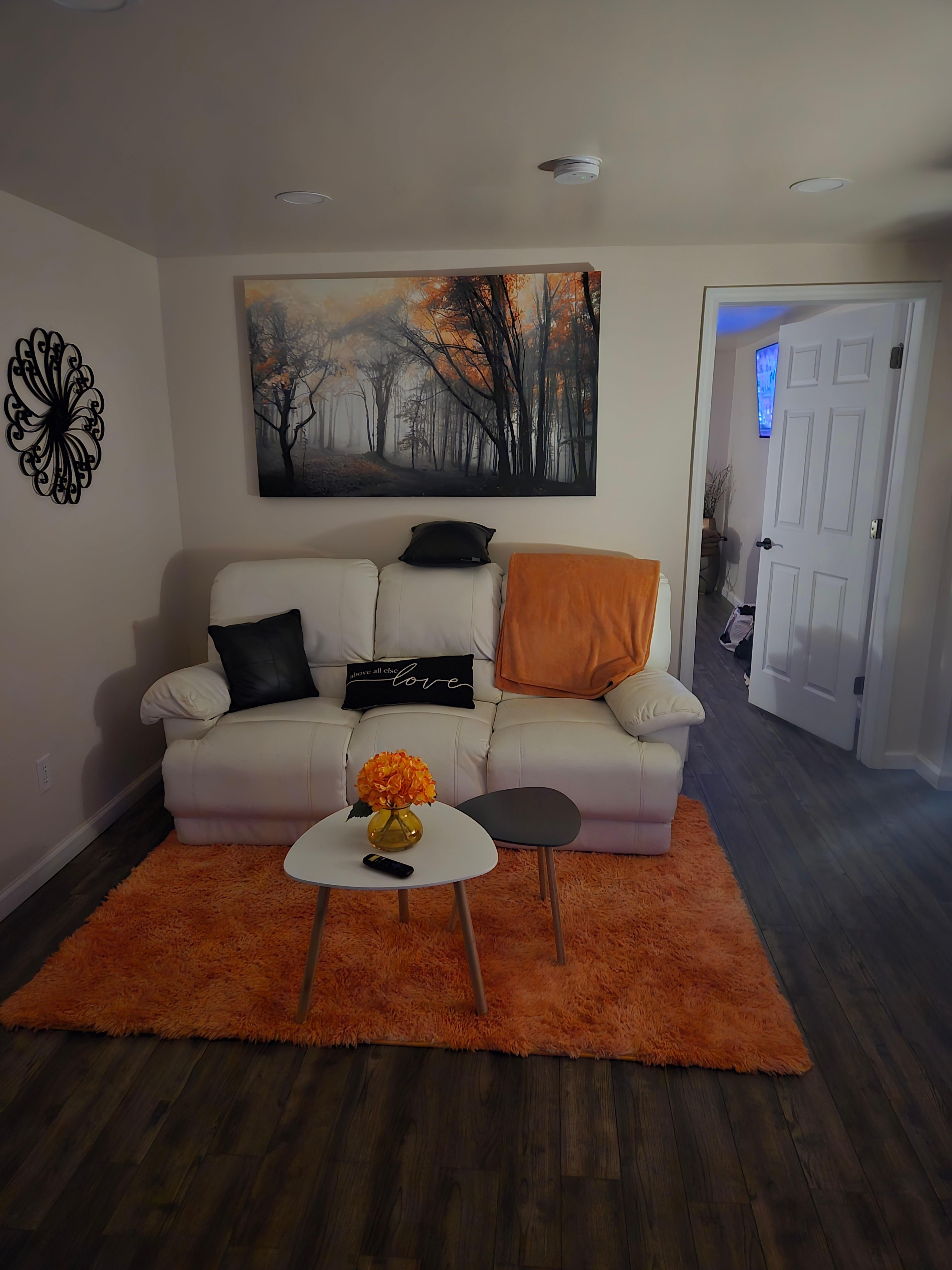 Our Loft has a spacious living room with a 55 ” Flat Screen TV over an Electric Fireplace, Air purifier and a Futon for extra sleeping arrangements.