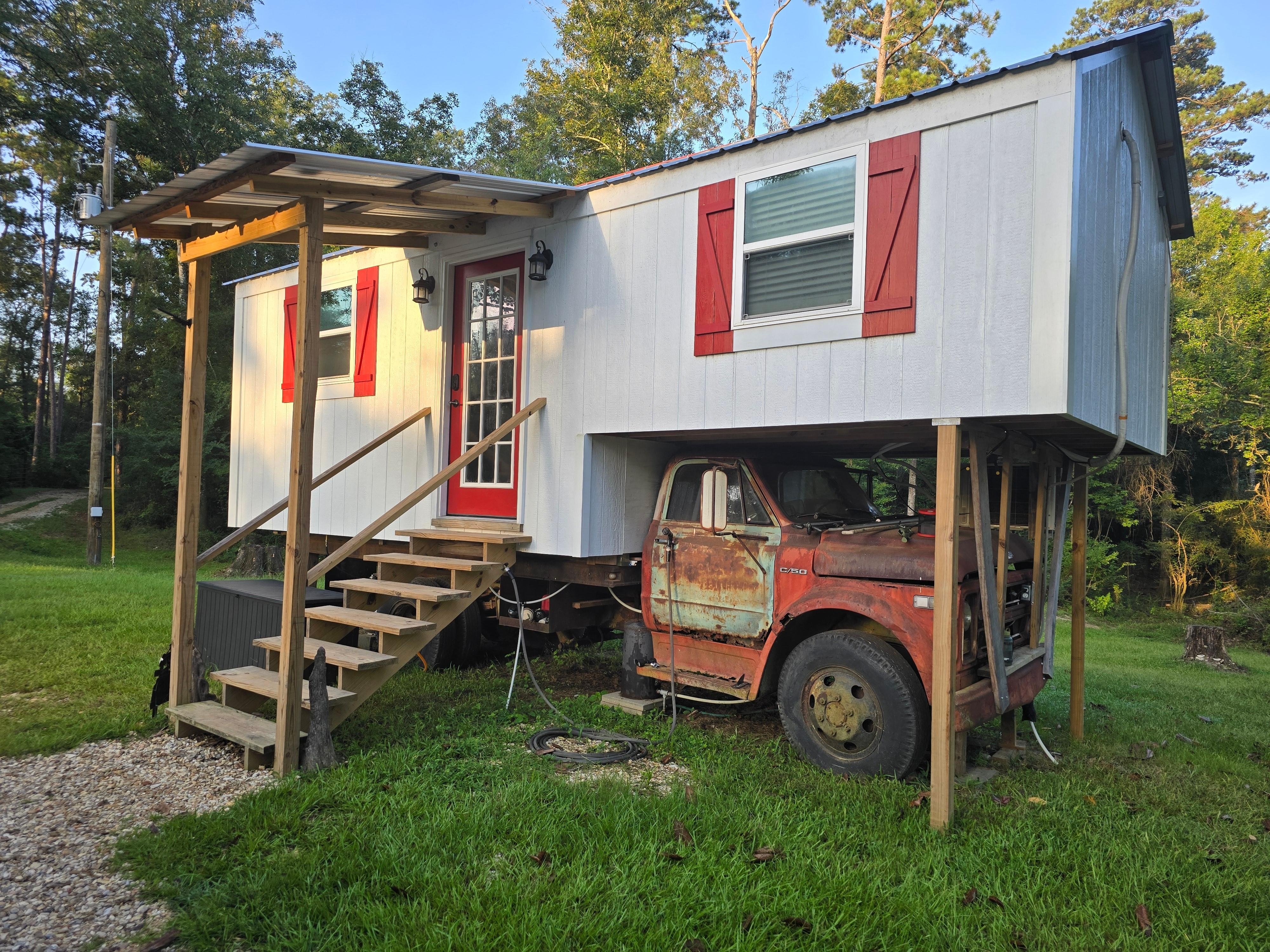 The truck home is parked on a peaceful and private water front property on the Tangipahoa scenic river.
