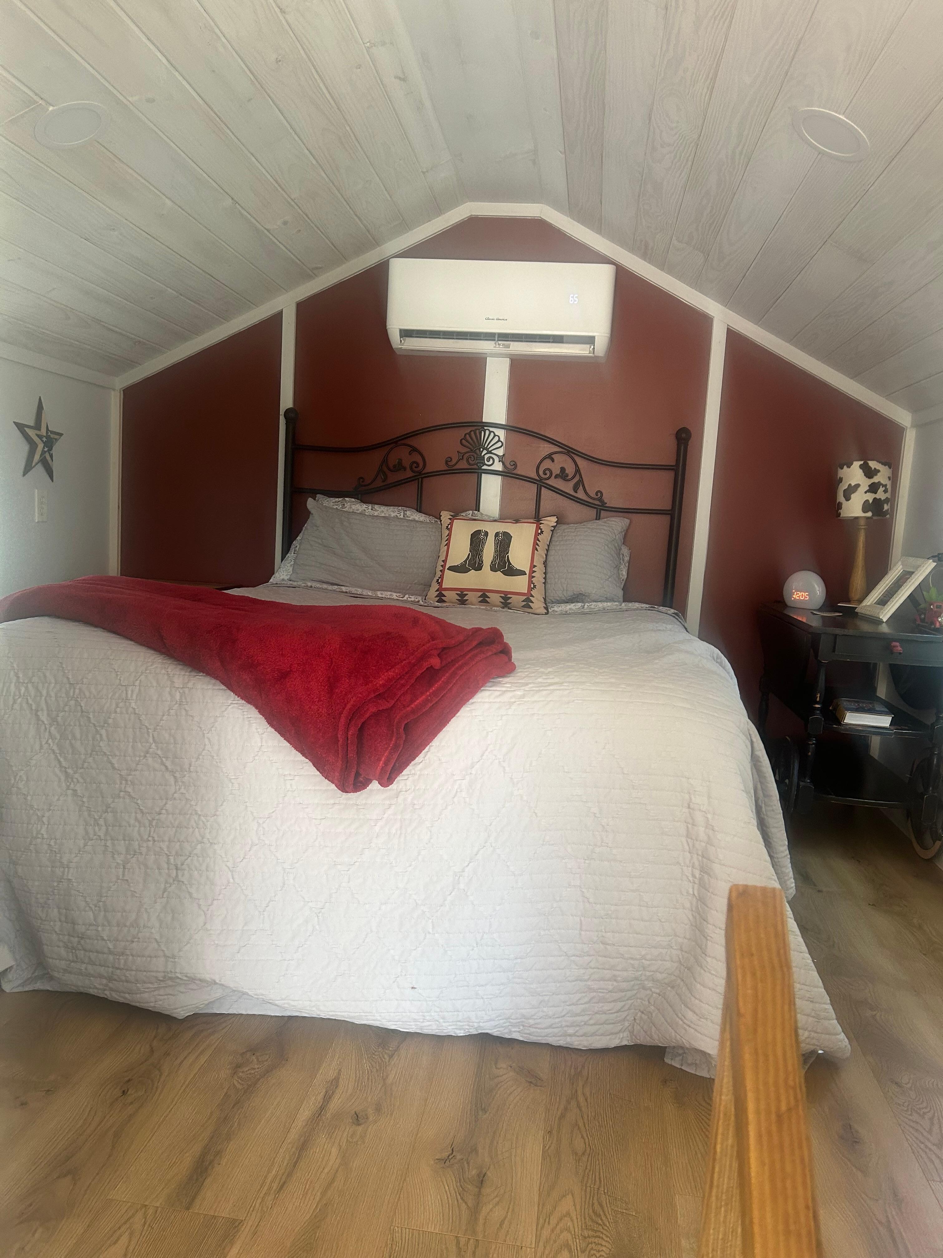 This is a one of a kind tiny home built on a vintage farm truck! This adorable truck house features a wonderful queen bed in the bedroom, perfect for a restful night's sleep, a full kitchen, and bathroom. The house also includes a cozy living room with a futon for extra guests.