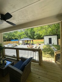 The home is spacious with a fantastic yard. It's absolutely the perfect place for indoor and outdoor entertainment. Guest can enjoy relaxing by the fire pit and cooking on the grill. There is cornhole, horseshoes, ping pong, and an outdoor movie screen.