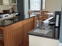 La cuisine est un délice pour le chef. Agencé efficacement avec beaucoup de comptoirs en granit, un espace de tiroir et des armoires suspendues de 42 pouces. Il a un long ßlot central avec un mini-évier supplémentaire et un espace de comptoir généreux pour la préparation et le service des aliments. La cuisiniÚre Viking a un remplisseur de pot pour remplir le pot de homard et un évent d'échappement. Le double évier principal a une poubelle. Nous avons un réfrigérateur cÎte à cÎte et un mini refroidisseur de boissons / vin dans les armoires. Il dispose également d'un four mural, d'un four micro-ondes, d'un lave-vaisselle Bosch, d'un grille-pain et d'une cafetiÚre. Nous sommes entiÚrement approvisionnés pour tout ce dont vous avez besoin pour la préparation et le service. Plus une surface de comptoir en granit pour deux.
