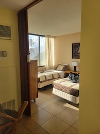 Ils seront Ă©galement jaloux des vues des deux chambres du Kauhale Makai 434. La suite principale, comme le salon / salle ïżœïżœ manger, s'ouvre sur le balcon; une fois que les enfants sont au lit, vous et votre amoureuse pourrez siroter un verre romantique au clair de lune au milieu des brises salĂ©es avant de vous glisser dans votre lit king-size. La suite principale comprend Ă©galement une tĂ©lĂ©vision, de nombreux rangements et une salle de bains privative. Avec deux lits jumeaux, la deuxiĂšme chambre est idĂ©ale pour les enfants. Il y a aussi la deuxiĂšme salle de bain. Avoir une salle de bain complĂšte pour chaque chambre fera des matins sans tracas.