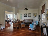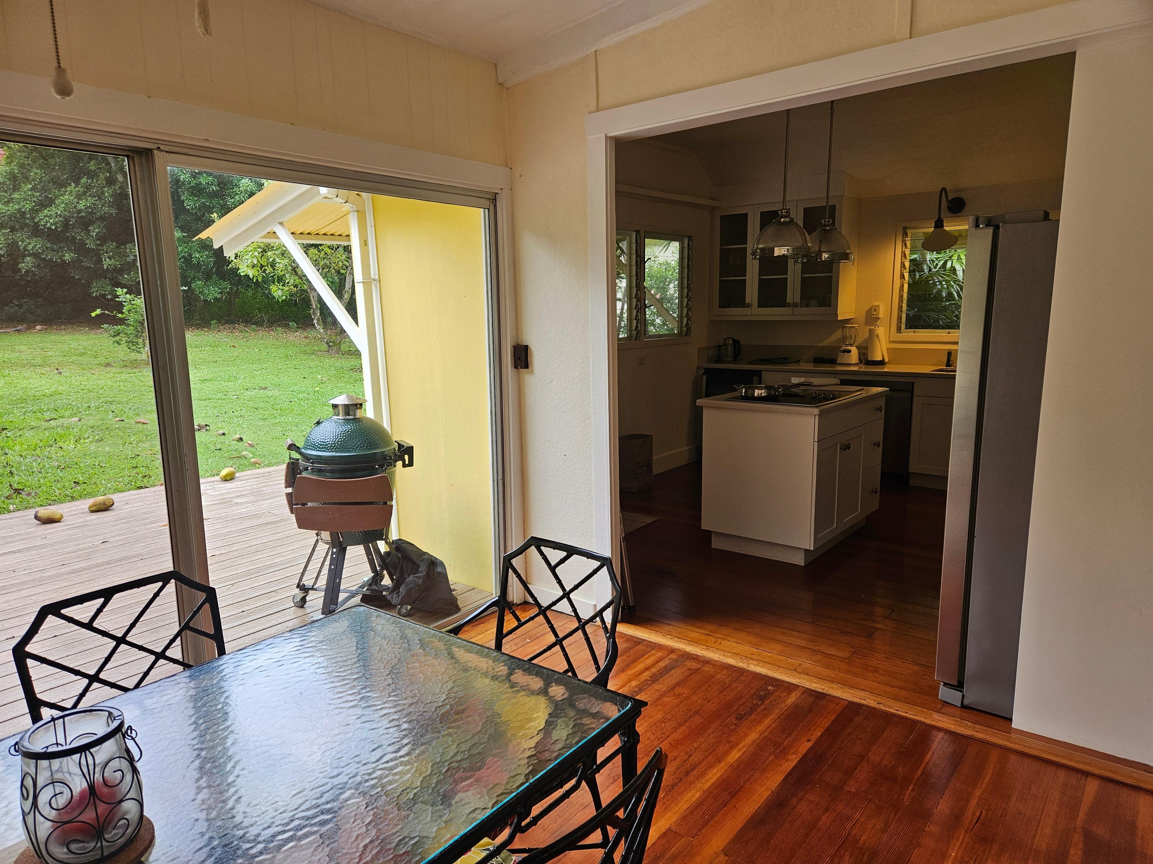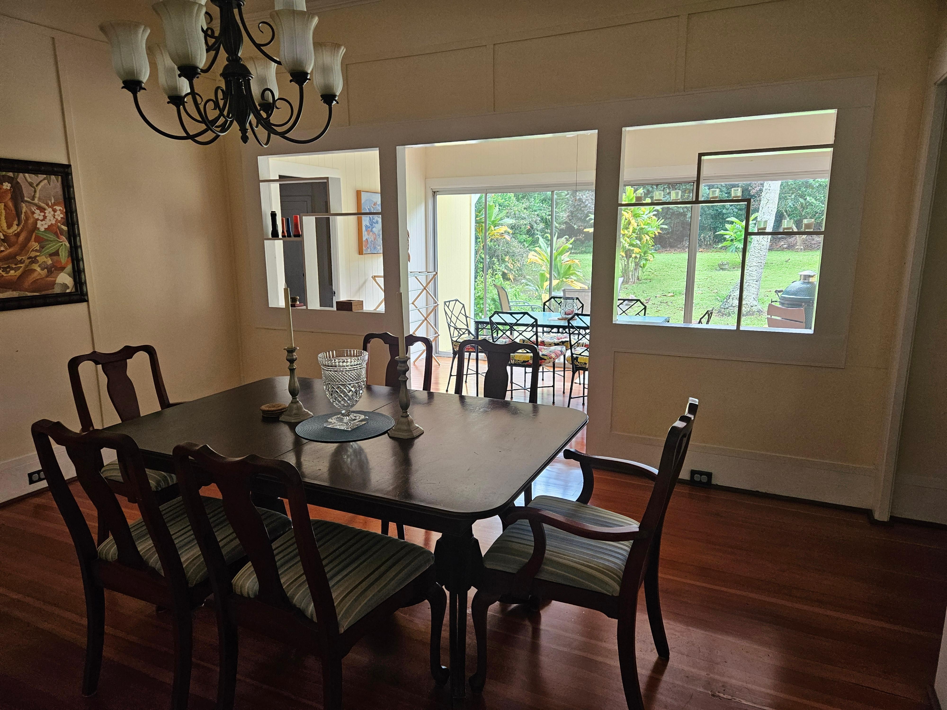 The house is tucked away yet close to amenities. A very private isolated back garden makes a perfect sanctuary full of the sights and sounds of nature and the wind blowing through the palms. Frequent sightings of local birds and the occasional wild piggy (harmless) always make meals in the garden room entertaining. A grand lanai across the front of the house is nicely exposed to the trade breezes and a great place to hang out throughout the day. A comfortable living room equipped with a flat screen TV (Cable, Apple TV and Netflix included).
