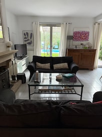 Maison sur 2 plans avec au rez-de-chaussée, salon, salle à manger, cuisine américaine toute équipée, 1WC et 1 cellier. Terrasse extérieure ombragée de 25m2 cÎté piscine avec barbecue. Jardin communiquant cÎté cuisine avec 1 ou 2 places voitures selon leur taille.
