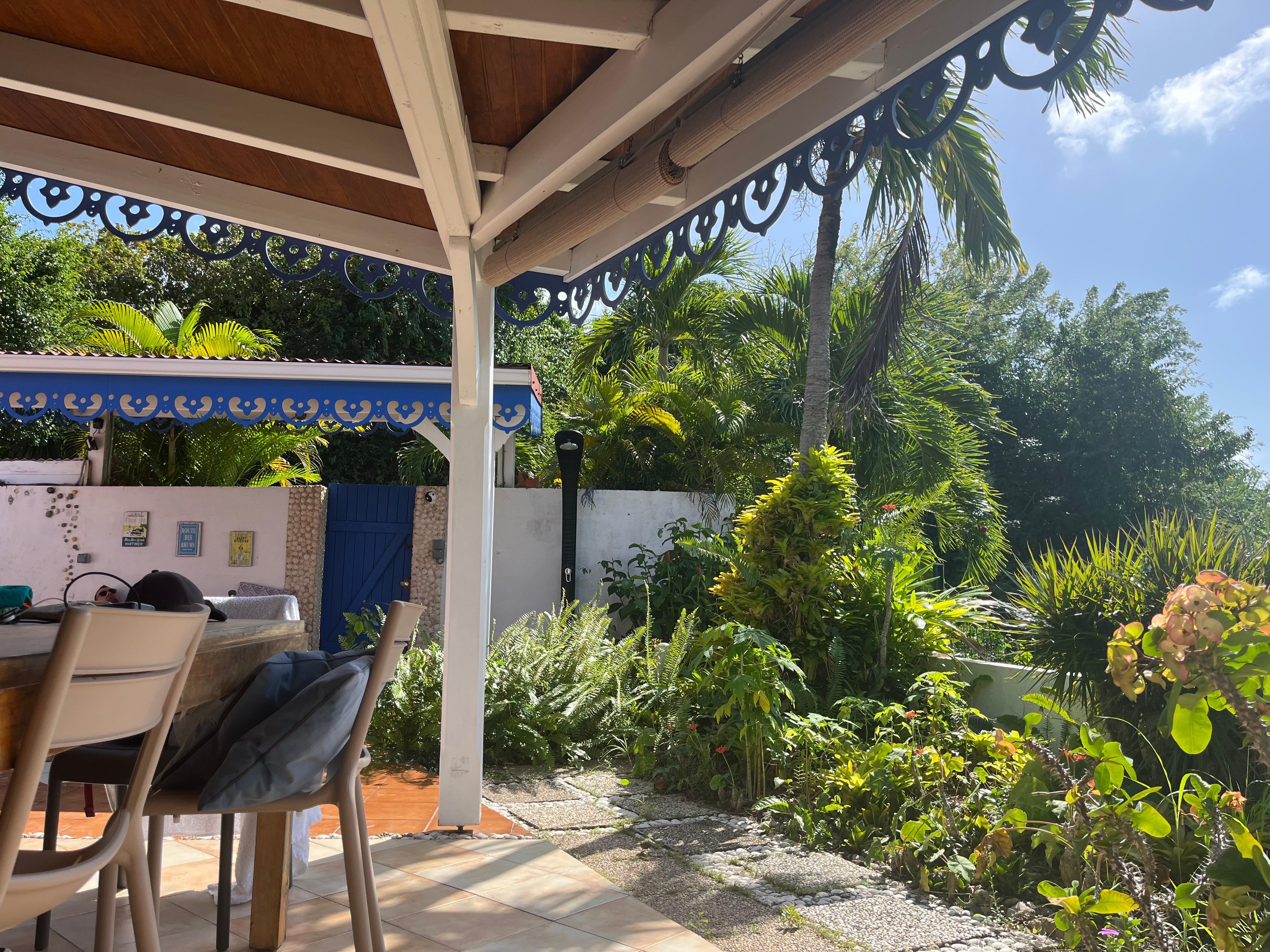 Les terrasses couvertes permettent de profiter à part entiÚre de l'extérieur à tout moment de la journée sur la baie de Sainte Anne et de son superbe couché de soleil.