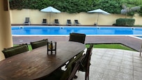 -Terrasse d'accĂšs Ă la piscine et au jardin (Ă travers le salon et la cuisine) avec chaises et table pour les repas dans une ambiance chaleureuse.