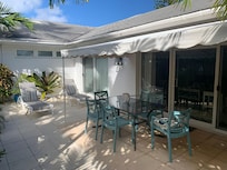 La villa a une grande terrasse privée, clÎturée avec une belle table de patio et des chaises longues. Dßnez dehors sous la canopée ou profitez d'un barbecue sur la terrasse. Notre villa fait face à la nouvelle piscine et est cachée de la rue.
