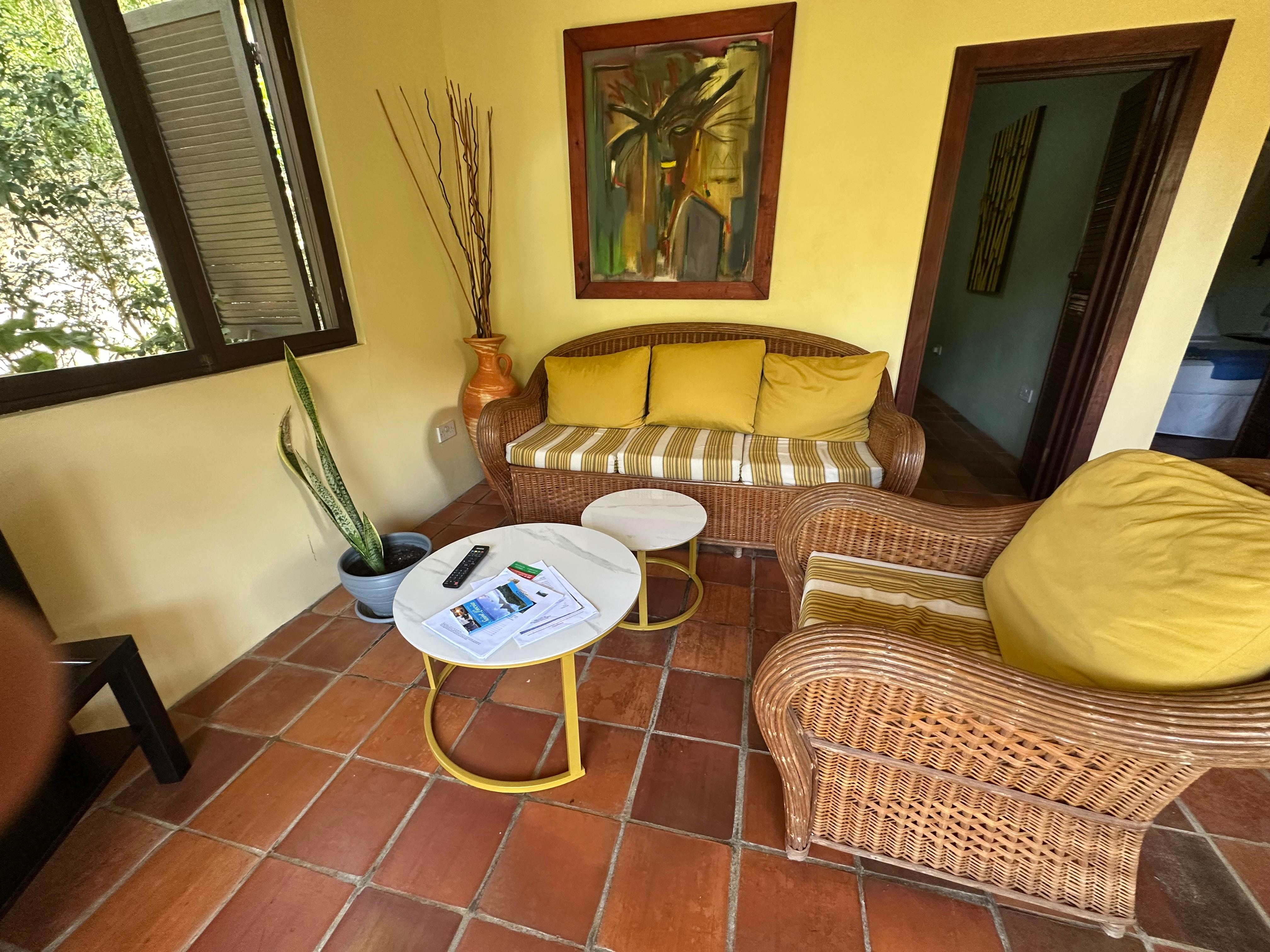 The apartment in this ad is the lower level of the guest house (left side on photos) and is composed of two bedrooms with Queen size beds, a bathroom with shower, a kitchen and living room. The kitchen and living room open up with wide louver doors onto a private private veranda for your meals and leisure time.