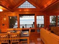 Beautifully designed Adirondack Contemporary 4-season 4-bedroom home with 96 ft of easy to access sandy shoreline has an open concept living area, with its many windows looking to the lake, flowing out to a large deck and attached screened-in sitting area.