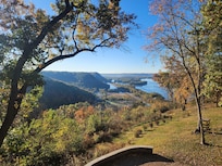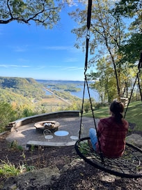 Enjoy breathtaking views of the Mississippi River while you relax, get cozy, and recharge in this newly decorated modern-rustic cabin situated high on the bluffs above the Mississippi River. Whether it is a family vacation, a girls/guys weekend, or a couples getaway you will enjoy the "Bluff House" inside and out. Take in the views with coffee on the deck in the mornings or sitting around a campfire on the large paved patio with a cold beverage of choice in the afternoon/evenings. There is never a shortage of things to see, whether it is boats and barges going by on the river, trains passing by on the tracks, or vehicles slowly moving by on the highway below.