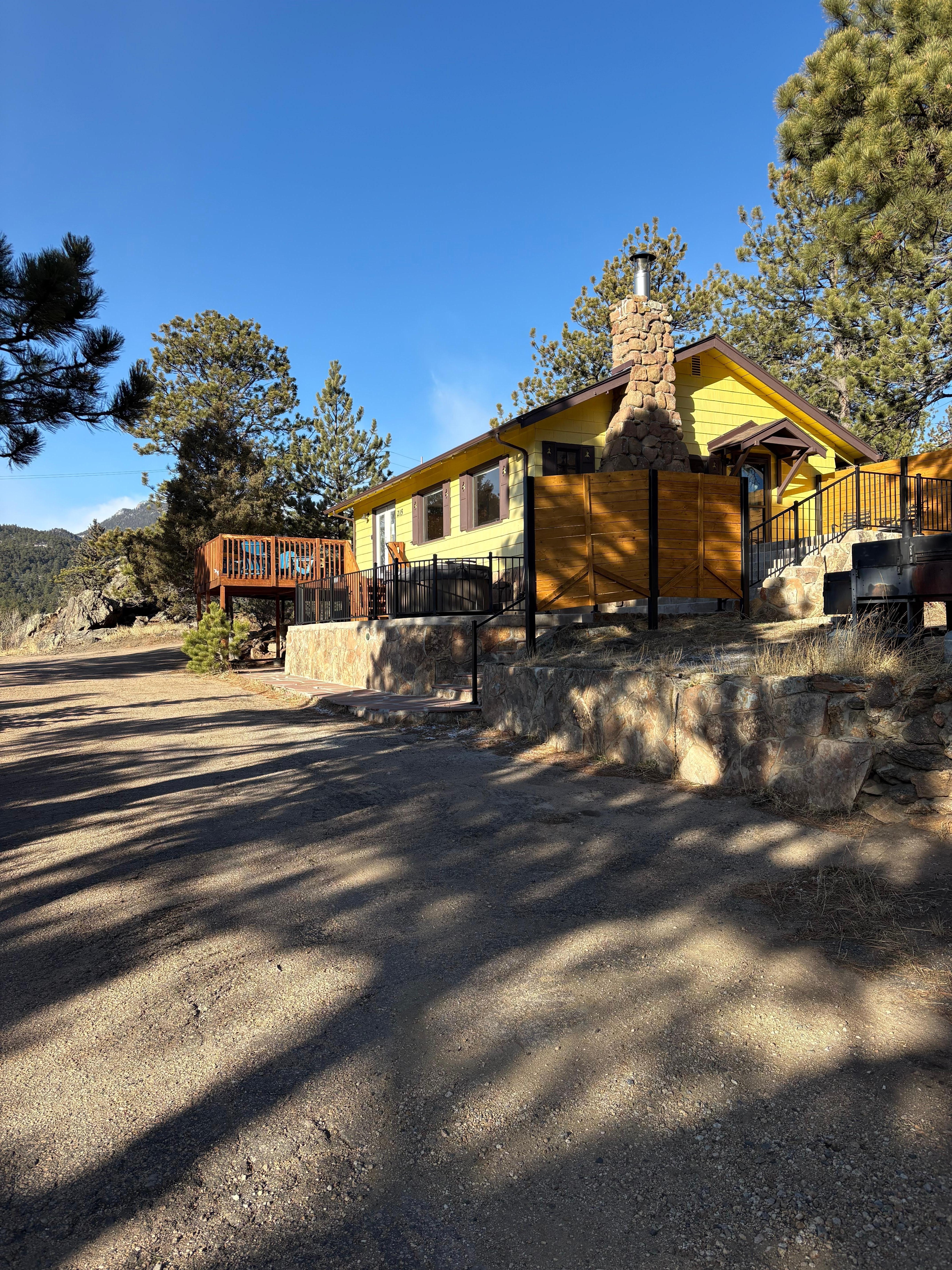 We have parking for two cars at our cabin, and it`s a short walk to the seasonal free bus system that goes around Estes Park and into the National Park. The home is located just above Elkhorn Avenue, which is the main street of Estes Park. Elkhorn is filled with shops, bars and restaurants.