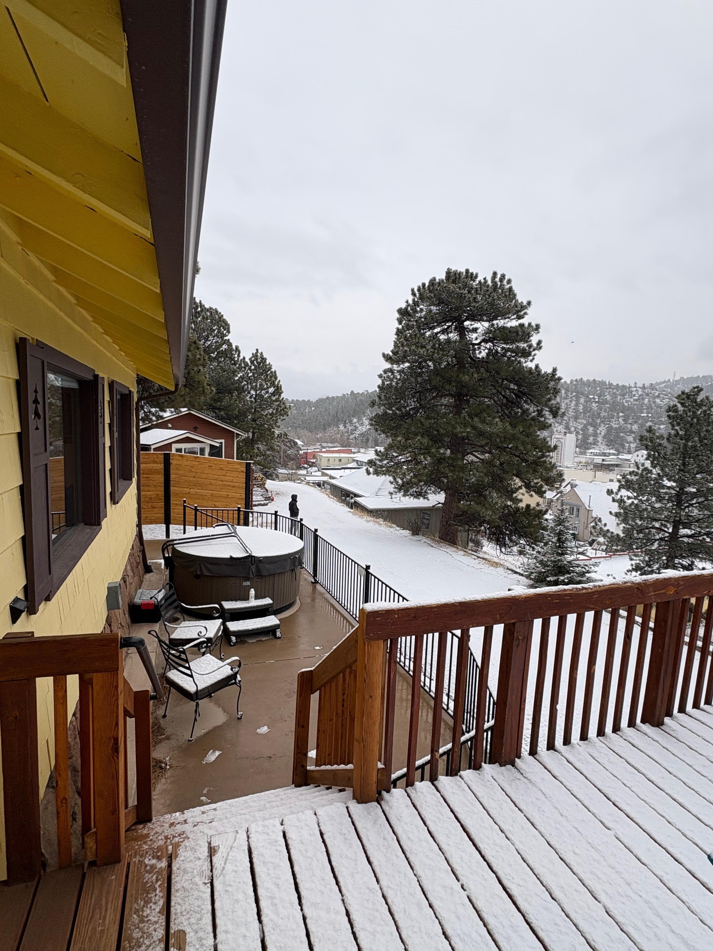 Enjoy Rocky Mountain View`s from the hot tub of our home perched on a quiet hillside above downtown Estes Park (STR#3219)! You`ll love my historic 100-year-old cabin, which has been fully renovated with all the modern comforts. Two bedrooms, open kitchen/dining/living area, gas fire pit outside,smart TV, hot tub on an awesome deck and views.