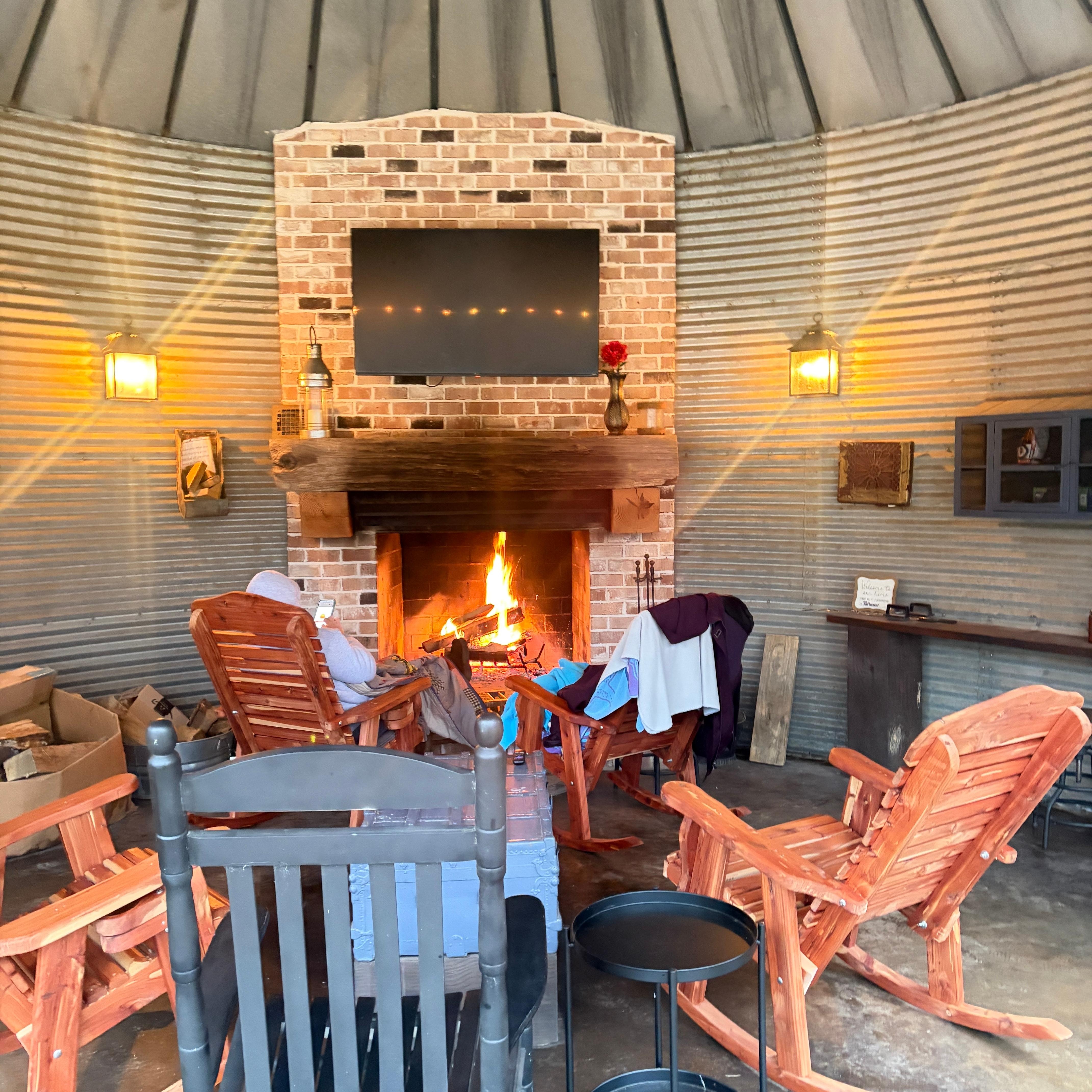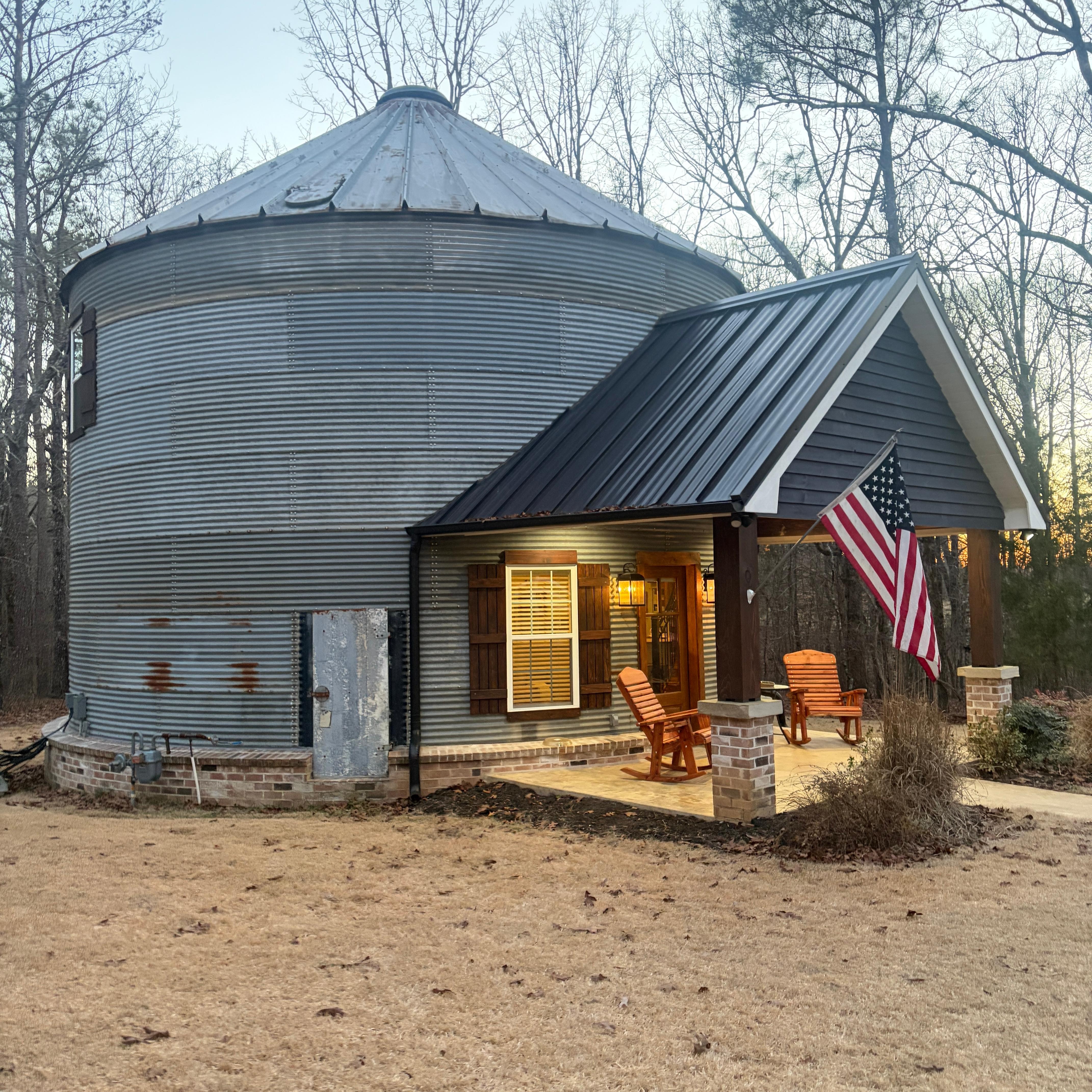 We have converted 2 old grain bins. One of the bins has a woodburning fireplace, TV, grill and seating. The other bin comfortably sleeps 4 and includes a full kitchen, bath and laundry, Den w/TV, and WiFi. Charcoal grill-charcoal not provided.