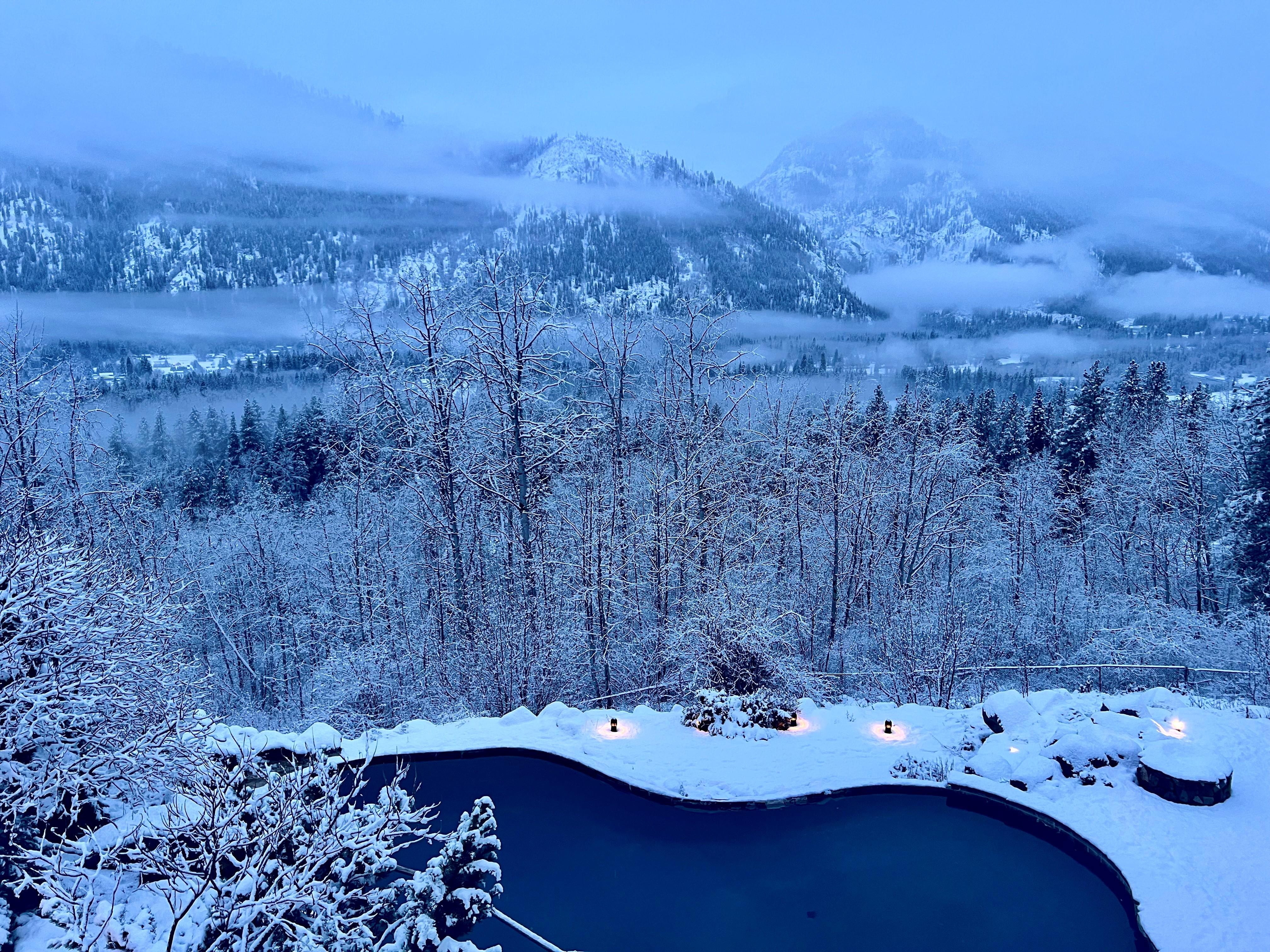 En hiver, vous pouvez profiter des vues sur les montagnes enneigĂ©es Ă 180 degrĂ©s, vous blottir dans une couverture autour du foyer sur le pont supĂ©rieur, construire un feu rugissant dans le poĂȘle Ă l'intĂ©rieur et profiter de la vue depuis le bain Ă remous. Comme nous sommes Ă 500 pieds au-dessus du village, nous avons gĂ©nĂ©ralement de la neige tout l'hiver.