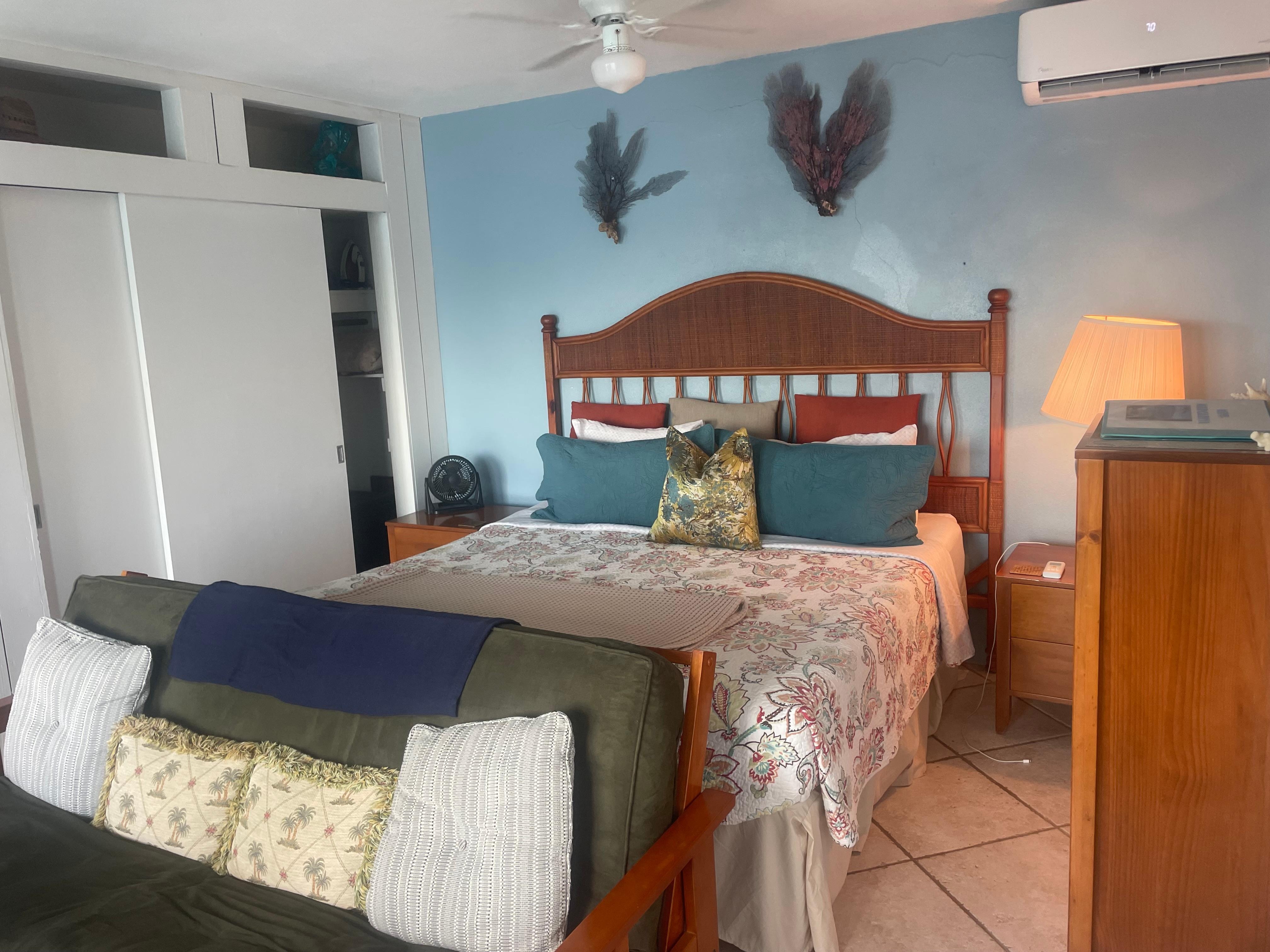 The studio has its own staircase from the parking area to its entrance, along with a private deck. The ocean trade winds keep the apartment cool, but air conditioning is available if you feel the need. Wi-Fi is available, TV with DVD player, no cable TV. Modest accommodations for a modest budget.