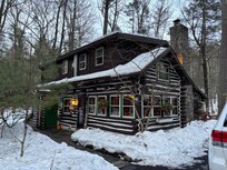 Rustic Rest Log Cabin, with hot tub and trout stream, near Poconos attractions.
