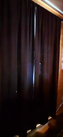 Cozy wood‑paneled retreat with a black leather sofa, warm lamps, and a softly lit private hot tub glowing just beyond the curtained window.