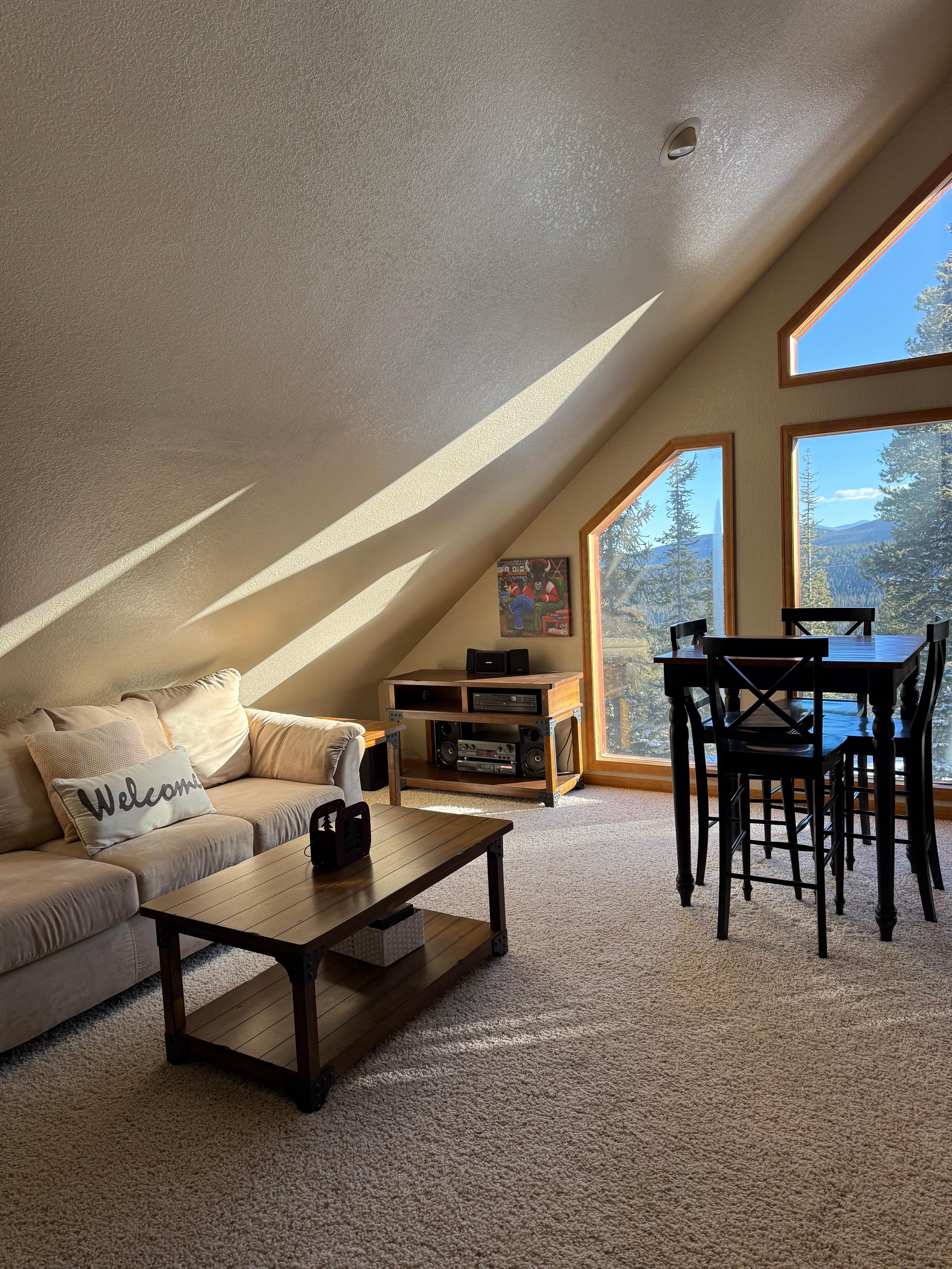 Make your way up the steps to the open loft where you can enjoy work or play at the high-top table with incredible views of Mt. Sherman, or snuggle into the loft couch for midwinter afternoons spent curled up with a tasty beverage and your favorite book. The loft Master Suite offers a spacious, airy room with high ceilings, a comfortable queen size bed fitted with cozy cotton bed linens and a large en suite bathroom. The bathroom features a standard toilet, double vanity, corner shower and huge walk-in closet - perfect for all of the adventure gear you may have brought along! Please note that the fireplace in the Master Suite isn't currently functional.