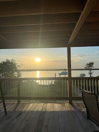 Take in the waterfront view of Chef Menteur Pass from your second story view, complete with ample seating and porch swing. Once inside, you'll be greeted by warm natural light, high ceilings and hardwood floors. The open concept floor plan is the perfect setting for entertaining and gathering your friends and family. All the comforts of home are here, with special amenities including a flat screen TV in the living room and one additional guest room, reliable WiFi, kitchen with updated appliances, private dock, and covered boat parking.