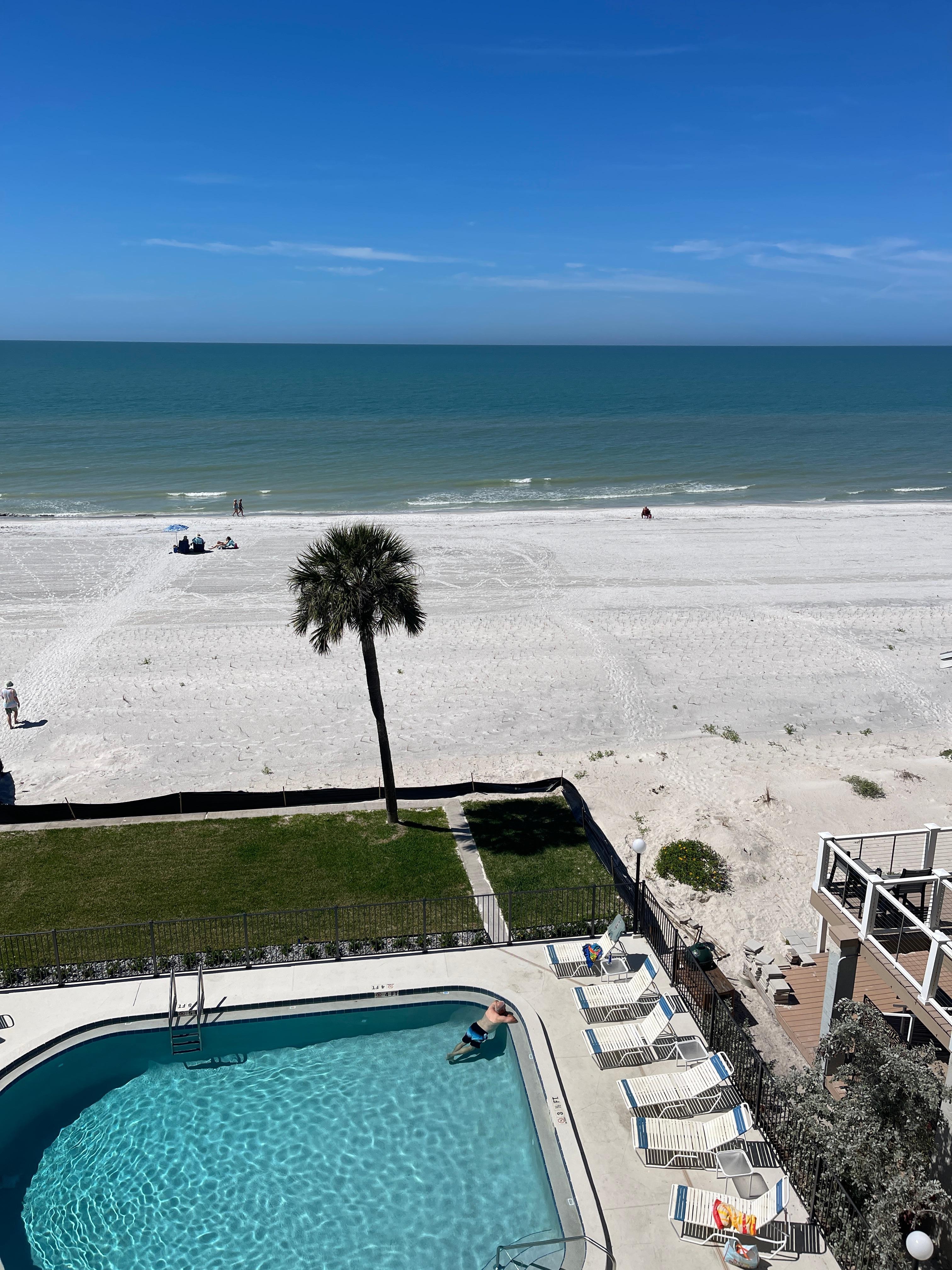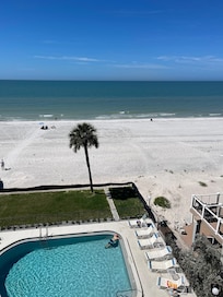 This 2 BR 2 BA end unit condo directly overlooks the beautiful white sand beaches of Indian Shores and the Gulf of Mexico. The spacious living area features an open concept design with the kitchen, dining room, and living room all overlooking the beach. The updated kitchen has everything you need to prepare a meal for your family in what will feel like a home away from home. There is a large 20 ft private balcony for your enjoyment. Views are breathtaking from here. The master bedroom has a king-sized bed for maximum comfort. The roomy second bedroom has two twin beds. The unit also contains books, board games, beach chairs, beach towels, etc so that all you need to bring is your bathing suit! The condo building only contains 12 units so you won`t have to deal with the big crowds of a massive resort. A heated pool and lounge chairs down by the beach for your use and relaxation. One assigned parking spot but community allows for one additional car to be parked in one of the guest spots. No pets, no smoking, and must be age 25+ to rent. No events/parties.