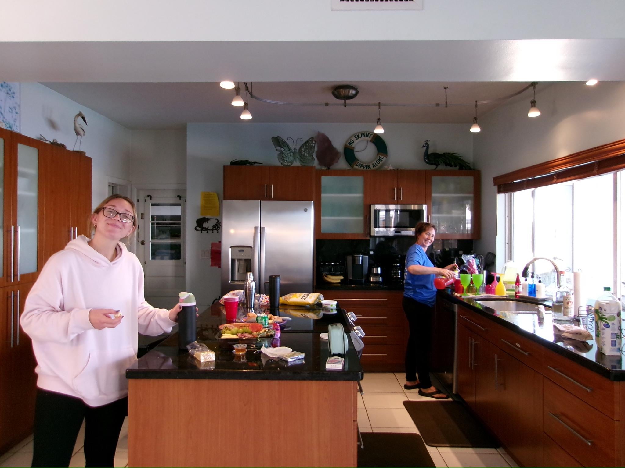 Prepare meals in the modern kitchen equipped with stainless steel appliances, granite countertops, and a scenic pass-through window to the enclosed patio. Additional amenities include a large HD television, outdoor gas grill, cable TV, and high-speed internet.