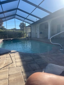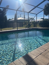 This 2-bedroom house is perfect for your escape to Port Charlotte. With 2 queen beds, this fabulous property offers a cozy and comfortable stay for guests. Pool is heated with solar panels and electric heat. The house features all the essentials you need, including iron, WiFi, hair dryer, washing machine, AC, and heating. The 2 bathrooms are equipped with showers and hair dryers. Plus, there's an additional living room with a cool sofa bed for extra space. You're sure to make fantastic memories with a stay at our place.
