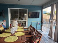 Create delicious family meals in our upgraded & well equipped kitchen, featuring stainless steel appliances, sleek quartz countertops, and modern fixtures that make cooking a joy. Just off the kitchen, the formal dining room seats sixâperfect for gathering around the table for meals or planning your next dayâs adventures. Step through the sliding glass doors to find an additional teak dining table that seats 8 on the back porch, offering a lovely outdoor option for enjoying meals or morning coffee.