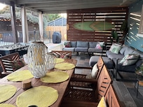 As mentioned, our outdoor space is truly the heart of this property, designed to bring everyone together for endless fun and relaxation. Begin on the spacious, covered porch, featuring two full-size couches and an 8-seat teak dining tableâideal for al fresco meals, evening conversations, or catching a game on the outdoor TV. Challenge friends to a game of ring toss or foosball and soak up the lively atmosphere.