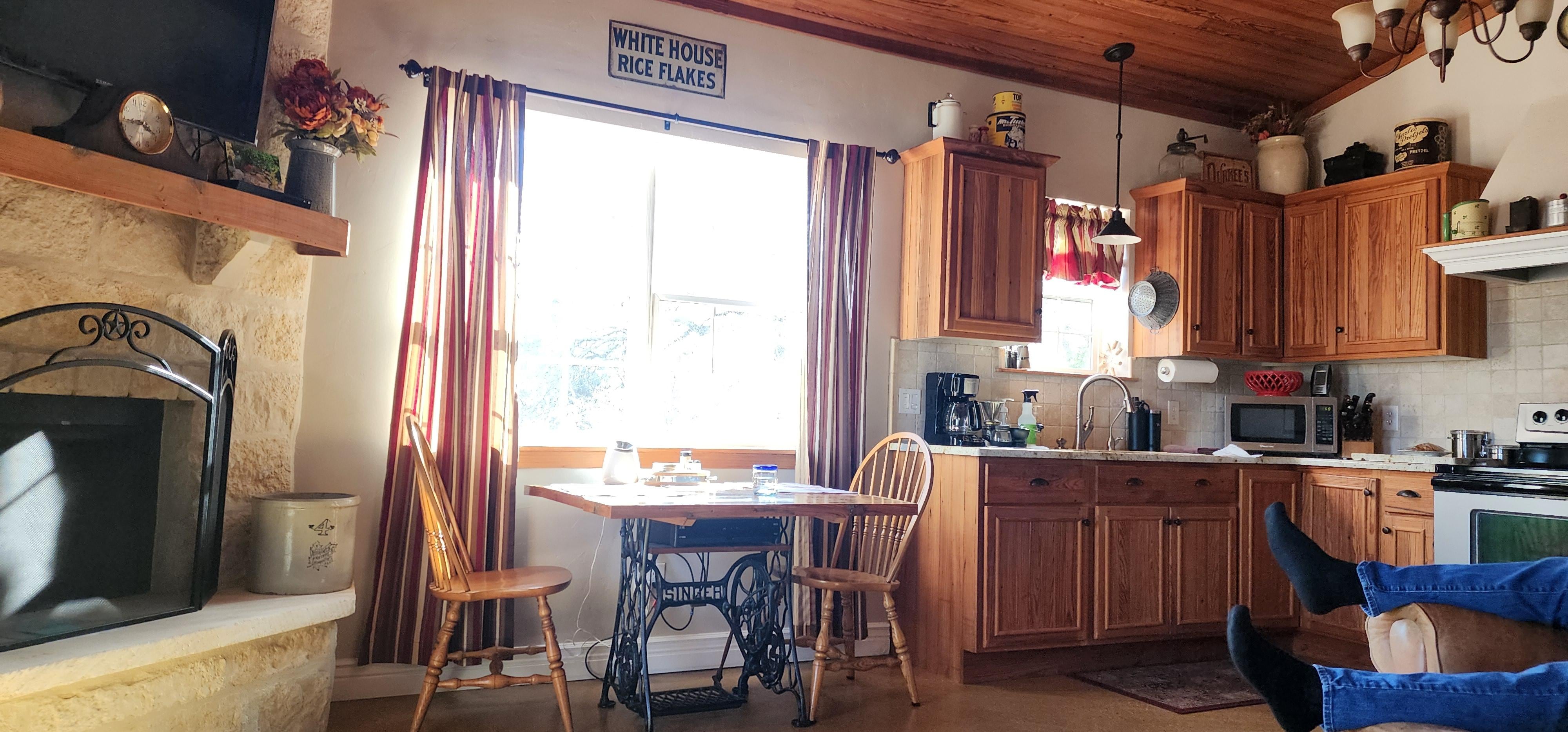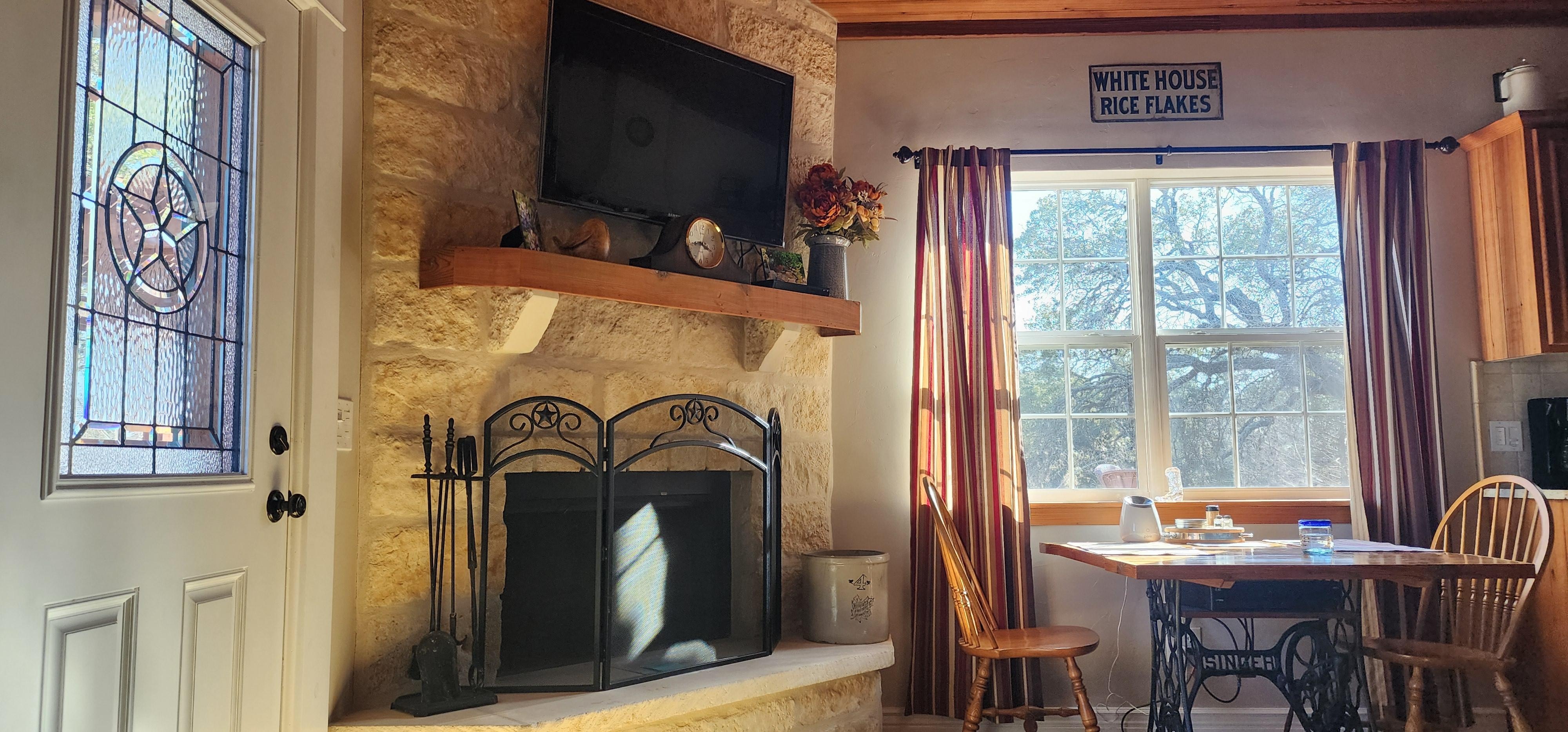 Creekside a été magnifiquement construit et décoré dans le charme Texas Hill Country, antiquités, et colorées des planchers en béton. Une cheminée en pierre grand feu de bois avec un "écran plat HD 40 est le point focal dans le salon / salle à manger spacieuse. Cette chambre dispose d'une attention aux détails avec un plafond voûté construit à partir de long pin feuilles récupérées à partir des années 1920 allemand Homestead en plus des armoires sur mesure tout au long. La cuisine a des comptoirs en granit et est entiÚrement équipé avec des appareils pleine grandeur, pot / casseroles, vaisselle. La chambre a également un plafond voûté et est trÚs confortable et calme pour dormir une bonne nuit sur les matelas de taille des draps de haute-fils de la reine de luxe. La salle de bain est trÚs spacieuse avec une grande douche.