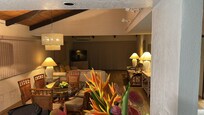 High vaulted open beam ceilings, large windows, and spacious sliding glass doors create a light, airy and spacious living area. Outdoor living with more than 380 sq ft of lanai with a BBQ, lounge chairs, and an outdoor table/chairs.